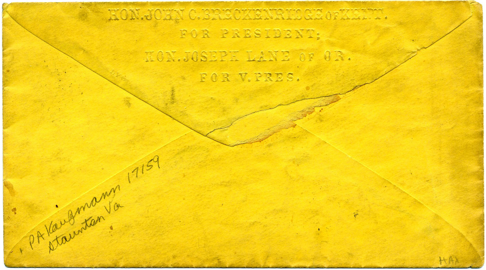 CSA 1, 5¢ green (faulty at upper left) tied grid cancel with matching light STAUNTON / Va. // JAN / 30 [1862] cds on 1860 BRECKENRIDGE AND LANE CAMPAIGN COVER with embossed imprints front “Constitutional Rights, Federal Protection in the Territories” and back flap “Hon. John Breckenridge of Kent for President; Hon. Joseph Lane of OR. for V. Pres.” Addressed to Messrs AA & B Stuart, Selma, Allegeny (sic) County, Viga. Rare Confederate use of 1860 campaign cover to / from the celebrated Stuart family. $950.