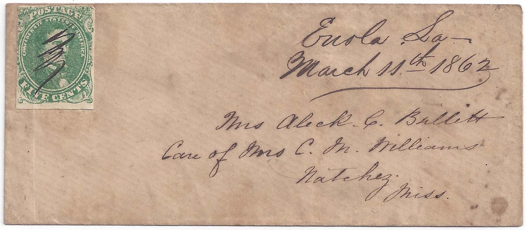 CSA 1, 5¢ green used with manuscript cancel and matching “Enola La March 14th 1862” postmark on narrow cover to Mrs. Aleck C. Bullitt, Care of Mrs. C.M. Williams, Natchez, Miss. Light cover file fold at left that affects the stamp plus back flap opening tears; fancy embossed initials M.S.R. on the flap tip. Scarce town. $170. Enola post office (Louisiana) was established December 17, 1861. More details on linked page. |