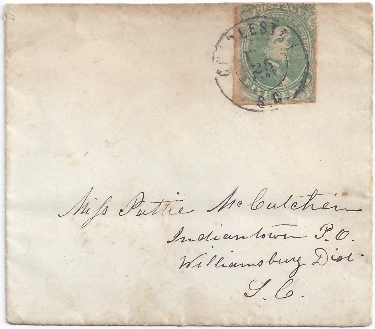CSA 1, 5¢ green (gum stains on edges) tied with CHARLESTON S.C. FEB 25 1862 double-circle datestamp on square commercially made envelope to Miss Pattie McCutchen Indiantown P.O., Williamsburg Dist., S.C. $110.