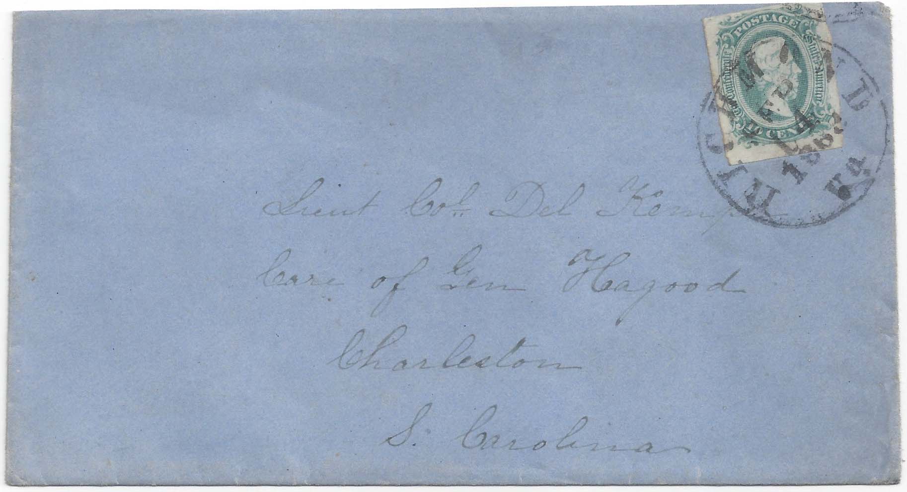 CSA 11-AD, 10¢ blue (4 margins) tied neat RICHMOND Va. SEP 14 1863 circular datestamp (Powell type 5d) on blue commercially made envelope to Lieut. Col. Del Kemper Care of Gen. (Johnson) Hagood, Charleston, S. Carolina; top back flap missing, Ex Harry Muldrow. $150.
