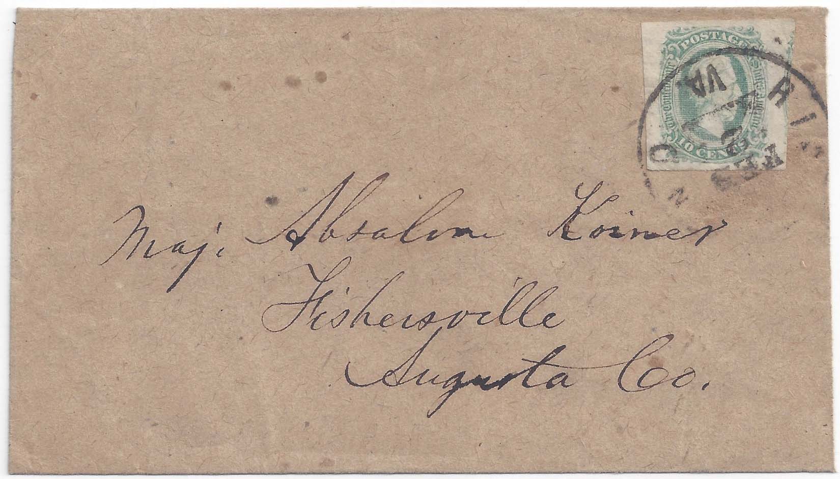 CSA 11-ADc, 10¢ greenish blue (4 large to enormous margins) tied RICHMOND Va. FEB 2 (1864) circular datestamp (Powell type 6L) on fresh cover to Maj. Absalom Koiner, Fishersville, Augusta Co. (Va.) Ex Wm A Fox and Harry Muldrow. $150.