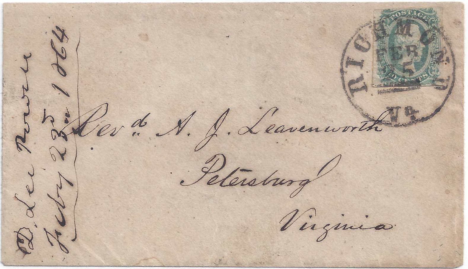 CSA 11-ADc, 10¢ greenish blue tied RICHMOND Va. FEB 25 (1864) circular datestamp (Powell type 5f) on fresh cover to Revd. A.J. Leavenworth, Petersburg, Virginia, with contents docketing D. Lee Powell, Feby 23d, 1864. Ex Harry Muldrow. $120.