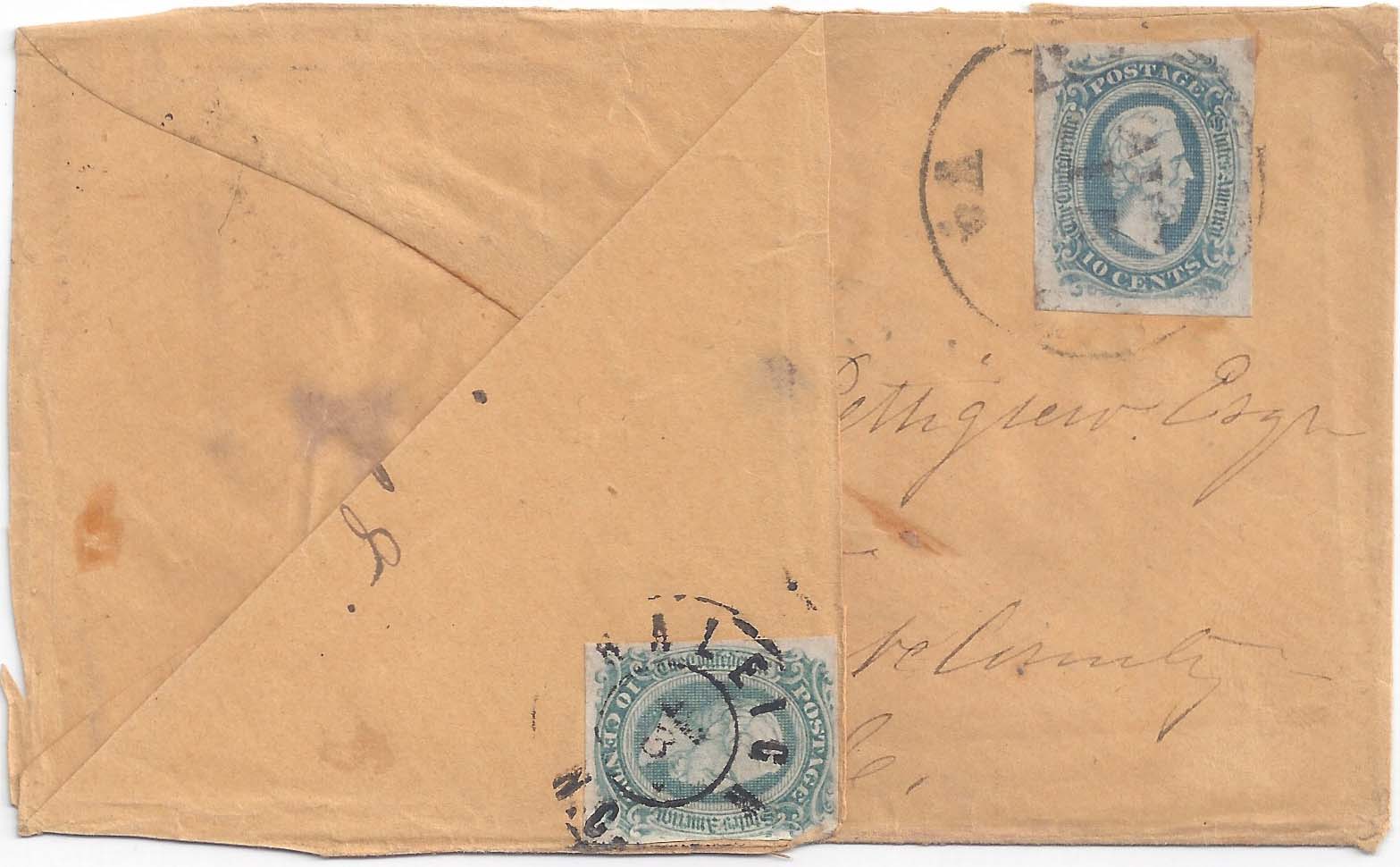 CSA 11-AD, 10¢ blue (4 margins) on TURNED COVER to William S. Pettigrew Esq, Tawborough, Edgecombe County N. Carolina (docketing as) from Mary B. Pettigrew. Open 3 sides to display inside, also franked with CSA tied RALEIGH N.C. double-circle datestamp to Miss Pettigrew, Box 528, Richmond, Virginia. Ex Harry Muldrow. $150.