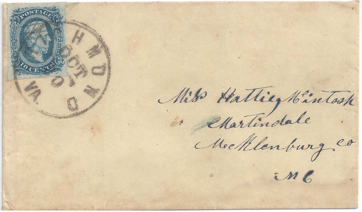 CSA 11-AD, 10¢ blue (4 margins) tied neat RICHMOND Va. OCT 10 (1864) circular datestamp (Powell type 6q) on cover to Miss Hattie McIntosh, Martindale, Mecklenburg Co. N.C. This postmark was used from October 1864 to February 1865. Ex Harry Muldrow. $150.