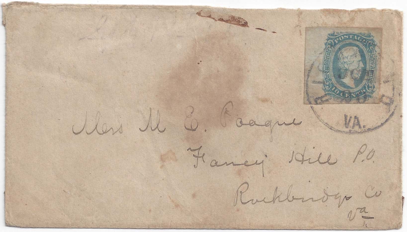 CSA 11-AD, 10¢ blue left sheet margin (4 margins, light crease) tied neat RICHMOND Va. OCT 20 (1864) circular datestamp (Powell type 6p) on cover to Mrs. M.E. Poague, Fancy Hill P.O. Rockbridge Co. Va. Ex Harry Muldrow. $90.
