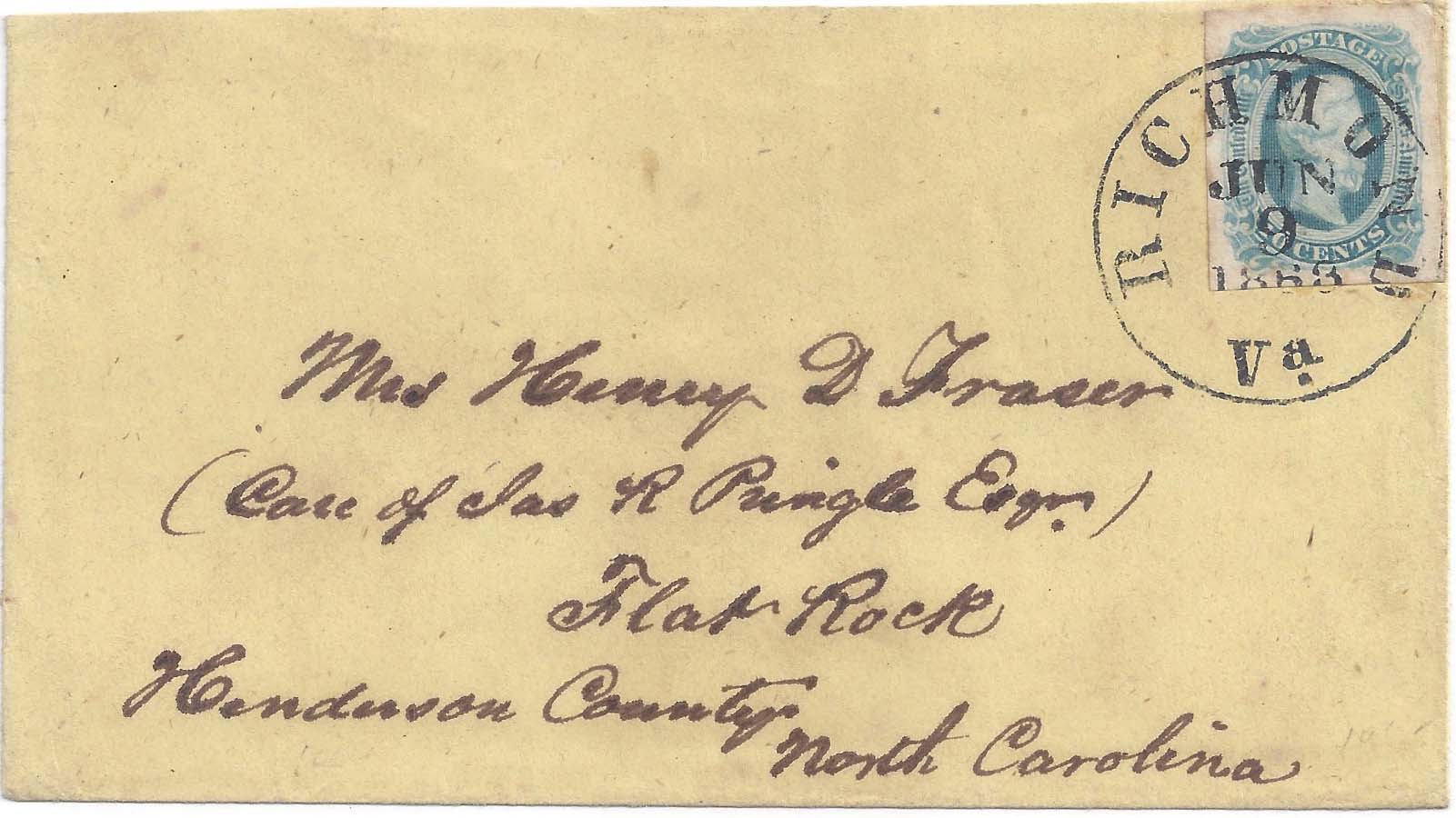 CSA 12a, 10¢ milky blue (4 large even margins) tied beautifully struck RICHMOND Va. JUN 9 1863 circular datestamp (Powell type 5a) on fresh cover to Mrs. Henry D. Fraser, (Care of Jas R Pringle Esqr.) Flat Rock Henderson County North Carolina, top back flap missing. Ex Harry Muldrow. $275.