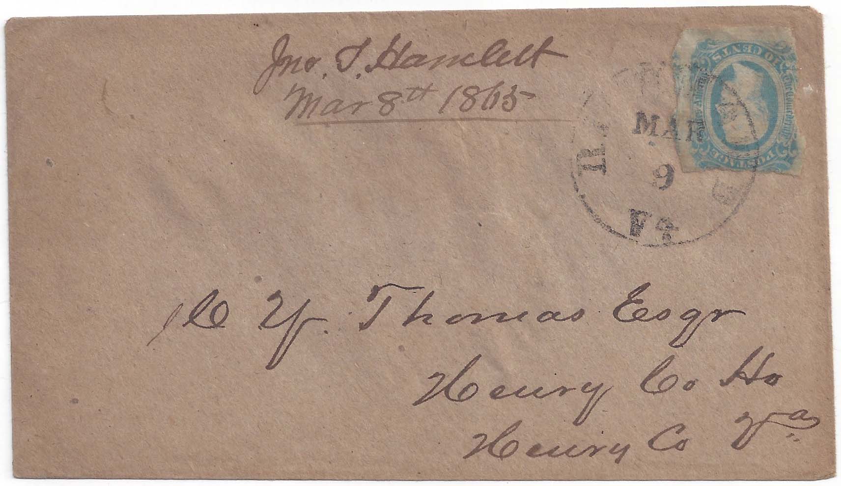 CSA 12-KBa-v4 10¢ bright blue overheated plate variety (roughly separated) tied neat RICHMOND Va. MAR 9 (1865) circular datestamp (Powell type 5g) on cover to C.Y. Thomas Esqr Henry Co Ho, Henry Co. Va. with contents docketing at top indicating sender was Jno. T. Hamlett. Very late use with 200% premium in CSA Catalog. Ex Harry Muldrow. $250.