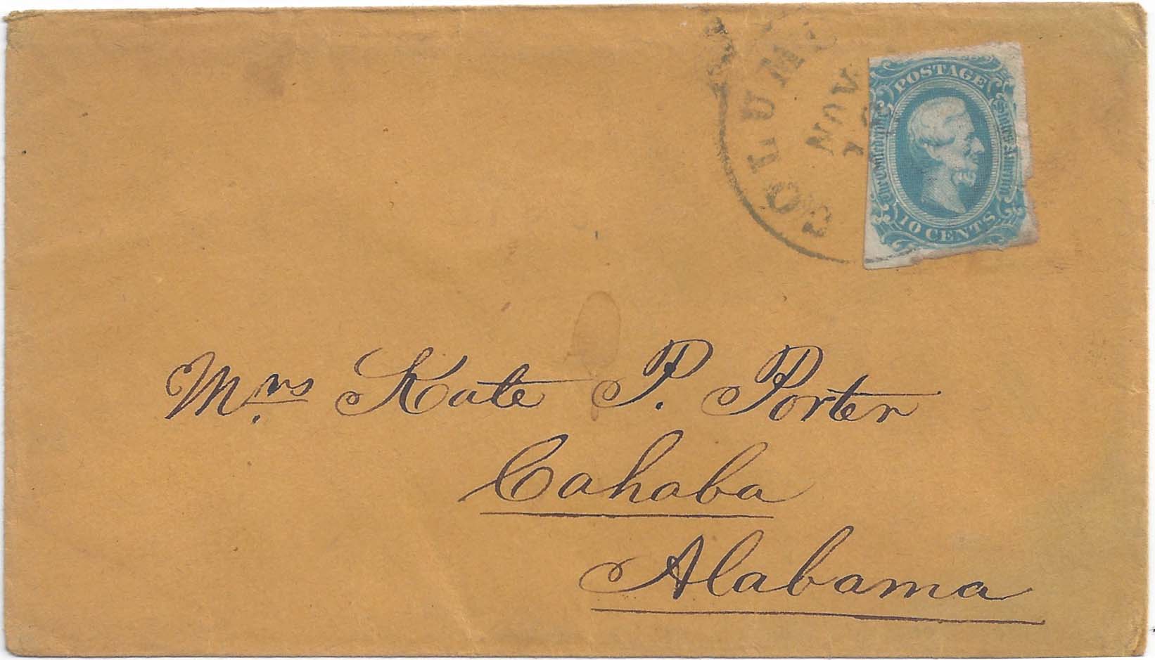 CSA 12a, 10¢ milky blue tied COLUMBUS Ga NOV 18 circular datestamp on cover to Mrs. Kate P. Porter, Cahaba, Alabama; tape repaired back flap opening tear. $150.