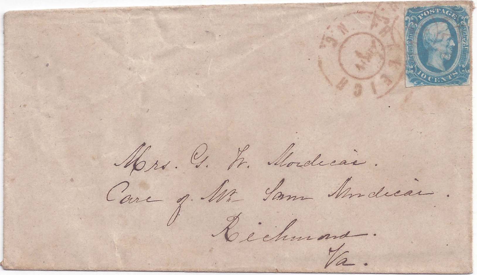CSA 12a, 10¢ milky blue tied double strike of neat red RALEIGH N.C. NOV 1 double-circle datestamp on cover to Mrs. G. W. Mordecai Care of Mr. Sam Mordecai, Richmond, Va., with flap opening tears. $170.