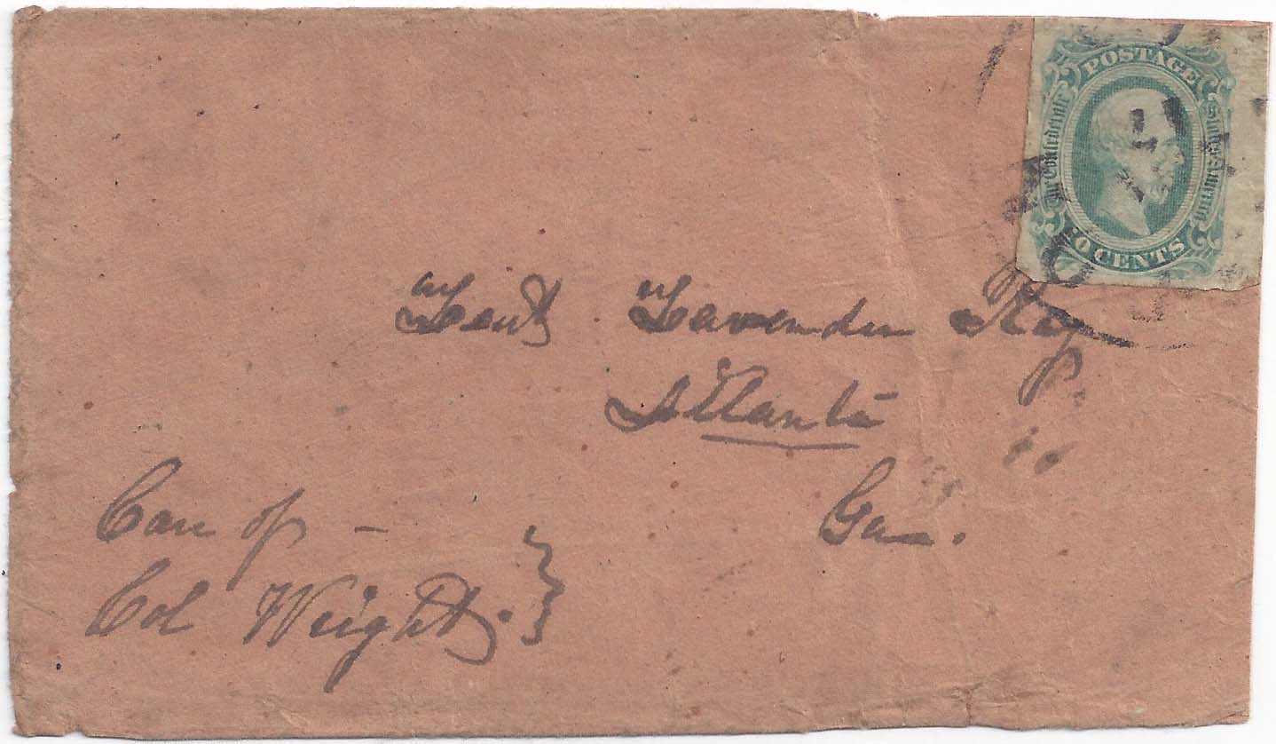 CSA 12-ADc, 10¢ greenish blue, right sheet margin with nice margins all around tied by indistinct balloon cancel of N.C. - awaiting a NC student to identify it - addressed on homemade cover to “Lieut. Lavender Ray, Atlanta, Ga. Care of Col. Wright.” Slightly reduced at right. Detailed military bio included with photocopy of CDV. $100.