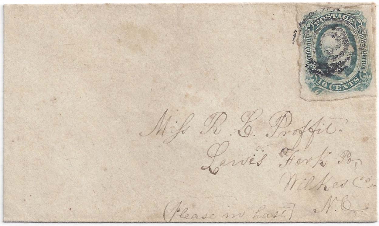 CSA 12-ADc, 10¢ greenish blue tied by Army of Northern Virginia target cancel (type ANV-13) on small cover to Miss R.L. Proffit, Lewis Fork PO Wilkes Co. N.C. Ex Richard Hall. $110.