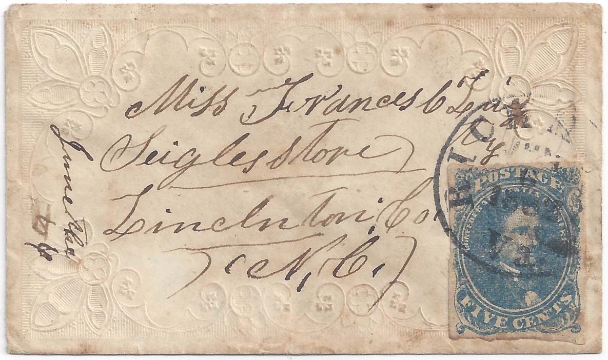 CSA 4-3-v1, 5¢ blue Stone 3 position 33 with C and E joined tied RICHMOND Va. JUN 6 1862 circular datestamp (Powell type 3b with broken N used only in June 1862) on darling tiny embossed lady’s cover to Miss Frances G. ?, Seigles (sic – Siegel’s) Store, Lincolnton Co(unty) N.C. SCV $500. Ex Harry Muldrow. $350.