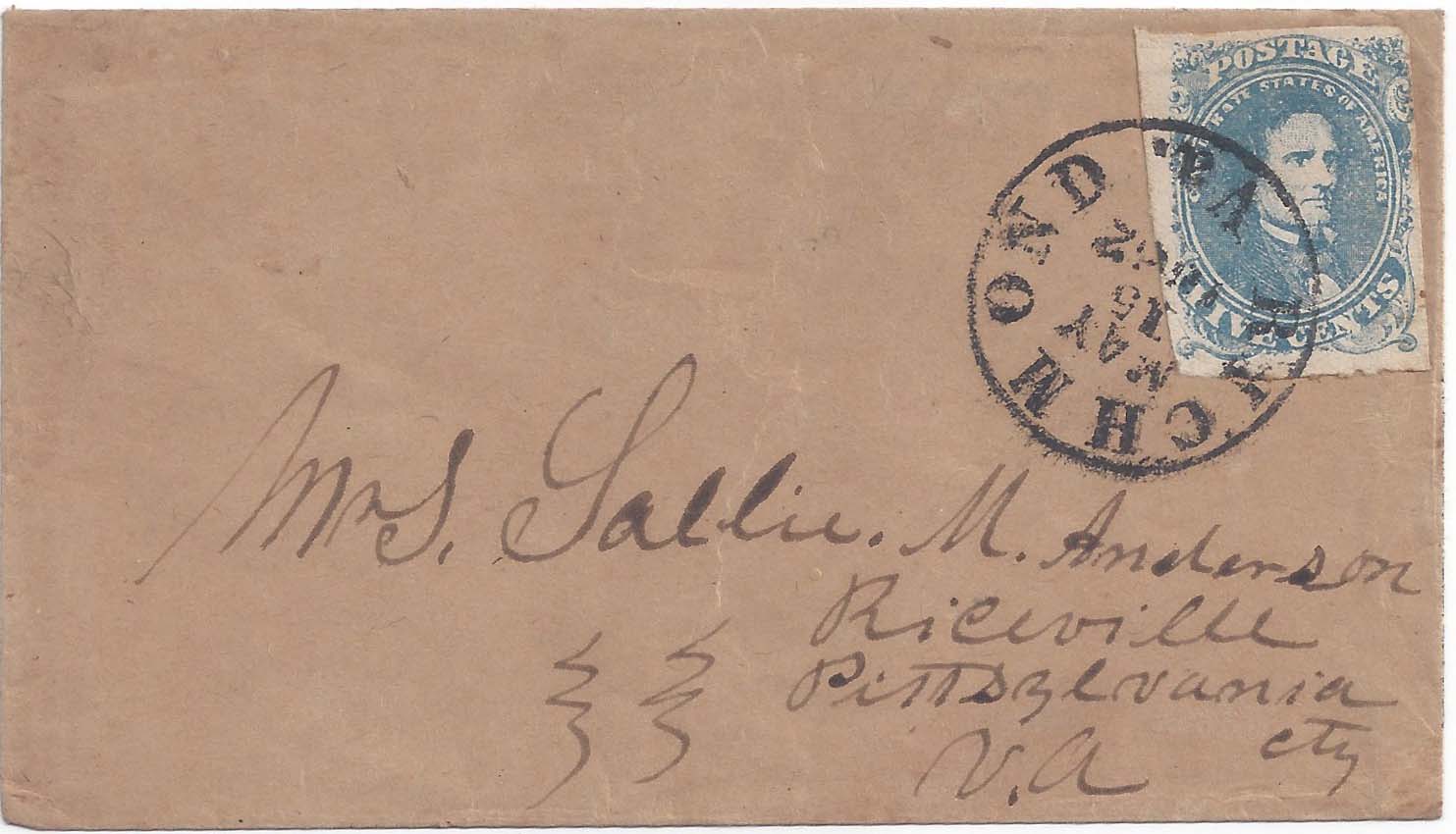 CSA 4-3-v3, 5¢ blue Stone 3 position 1 with “Leaking N” tied beautifully struck RICHMOND Va. MAY 15 1862 circular datestamp (Powell type 3a) on cover to Mrs. Sallie M. Anderson Riceville Pittsylvania Cty Va. SCV $500. Ex Harry Muldrow. $400.