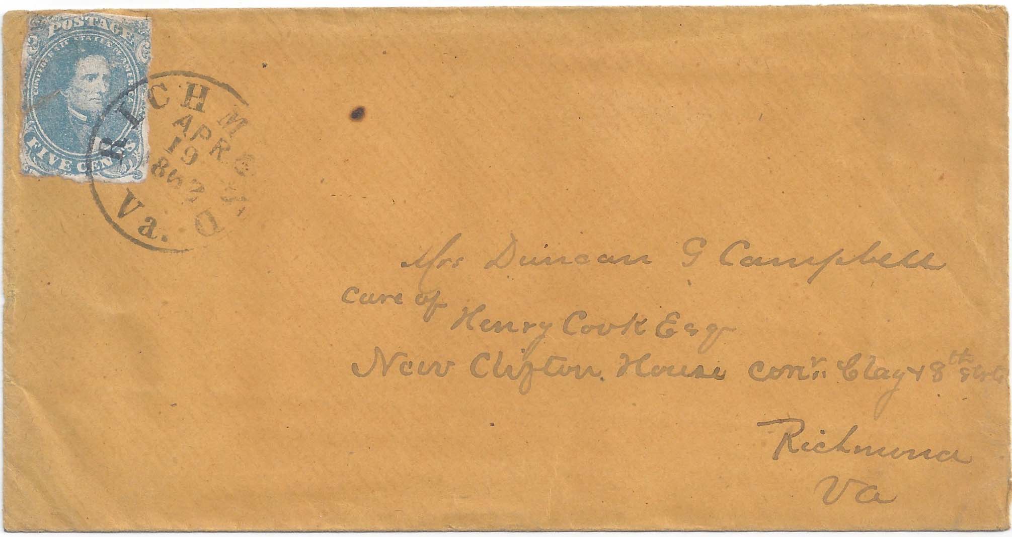CSA 4b, 5¢ milky blue (sealed tear and creases) tied RICHMOND Va. APR 19 1862 circular datestamp (Powell type 3a), purported to be Stone 3 but not verified by me. OVERPAID DROP use (SCV $400), not uncommon as soldiers traveling through Richmond often carried letters to drop in the mail there, on fresh cover to Mrs. Duncan G. Campbell, Care of Henry Cook Esq, New Clifton House corner Clay & 8th Streets, Richmond, Va. Ex Harry Muldrow. $250.
