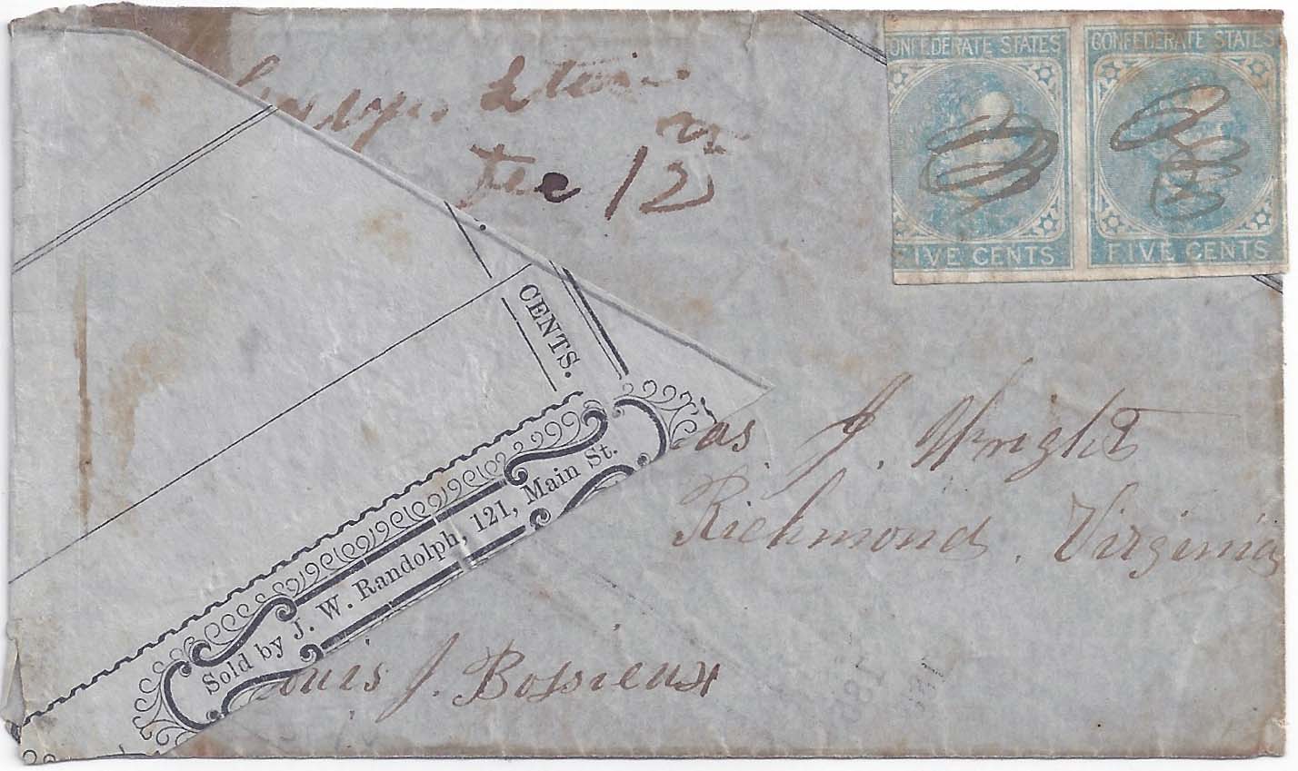 CSA 7-R, 5¢ blue pair used with pen squiggles and matching Gary’s Store Va Dec 12 manuscript postmark on adversity cover to Thomas J. Wright, Richmond, Virginia, care of Capt. Lewis J. Bossieux, fashioned from fancy printed ledger sheet with tape-sealed tear under turned-back flap at top. Ex Renate Thayer. $90.