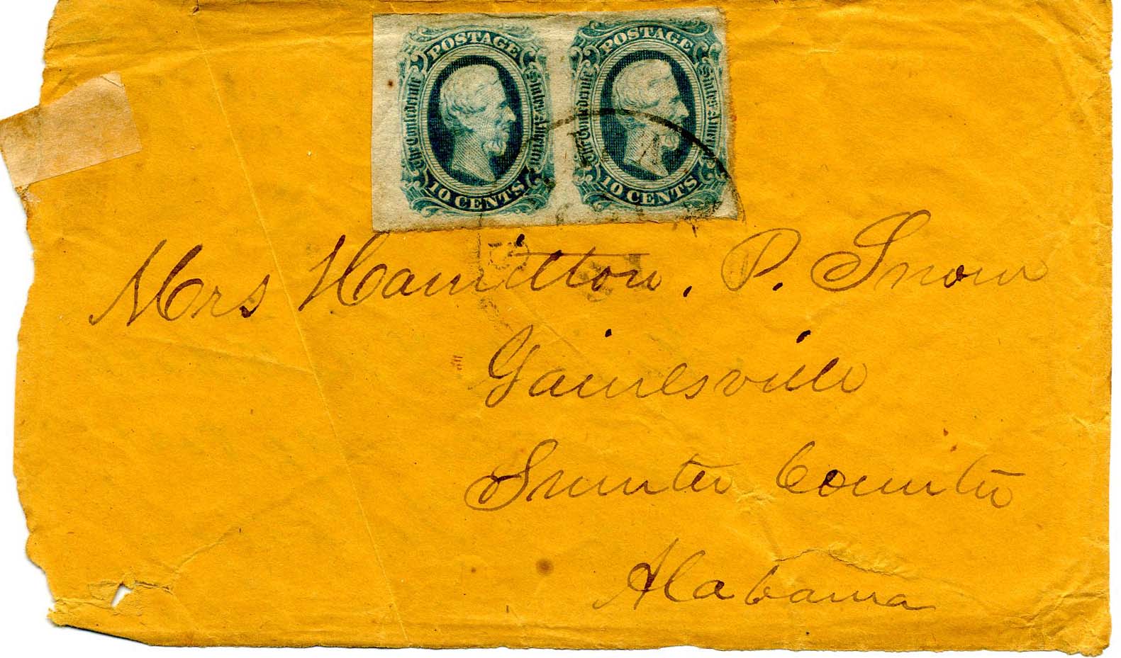 CSA 8, 2¢ brown-red tied bold SELMA / ALA // OCT / 22 cds on cover to Maj. W. T. Wallthall (sic), Comdg Post, Talladega, Ala, with O.B. at upper left (Official Business) and Chg [box] 65 above stamp which is overhanging edge of cover, stamp corner torn off and secured back in place; TURNED COVER franked with pair of CSA 12 and addressed to Mrs. Hamilton P. Snow, Gainesville, Sumter County, Alabama. Cover fully exploded to show both sides. The 2¢ rate is a bit of a mystery as it is not a local drop rate (towns > 100 miles apart) and does not appear to be a circular use. $700.
