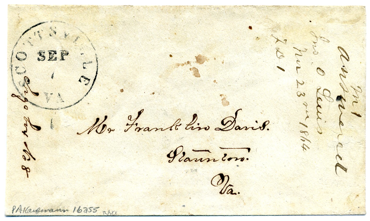 CSA 8, 2¢ brown red strip of 5 with right sheet margin at right used to sealed back flaps of cover tied with three strikes of SCOTTSVILLE / VA. // SEPT 1864 cds. Per the 1976 PF Certificate, “the third and fourth stamps are damaged by opening and are now mended and are genuinely used on cover.” A fourth strike of the postmark, dated Sept, is used on the obverse and is addressed to well-known nurseryman Franklin Davis, Staunton, Va. with content docketing indicating correspondent was Jno. O. Lewis. SCV $4,500. $3,000.