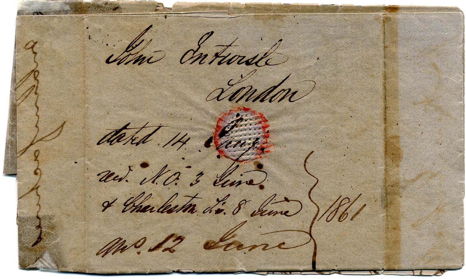 Incoming trans-Atlantic folded letter from London to New Orleans bearing portion of 1d British stamp with barred numeral cancel, ms. “P[er] New York Steamer from Southhampton” to Edwd. Menlove, Esq., New Orleans, La. CSA Use of US postage period. Although President Lincoln ordered a naval blockade against Southern ports on April 19, 1861, the letter, mailed on May 14, 1861, was forwarded by the USPO to the CSA per agreement between the two warring nations before the blockade become effective. Letter extensively deteriorated with adhesive tape repairs to file splits. Ex Kaplan and Fisher. $325.