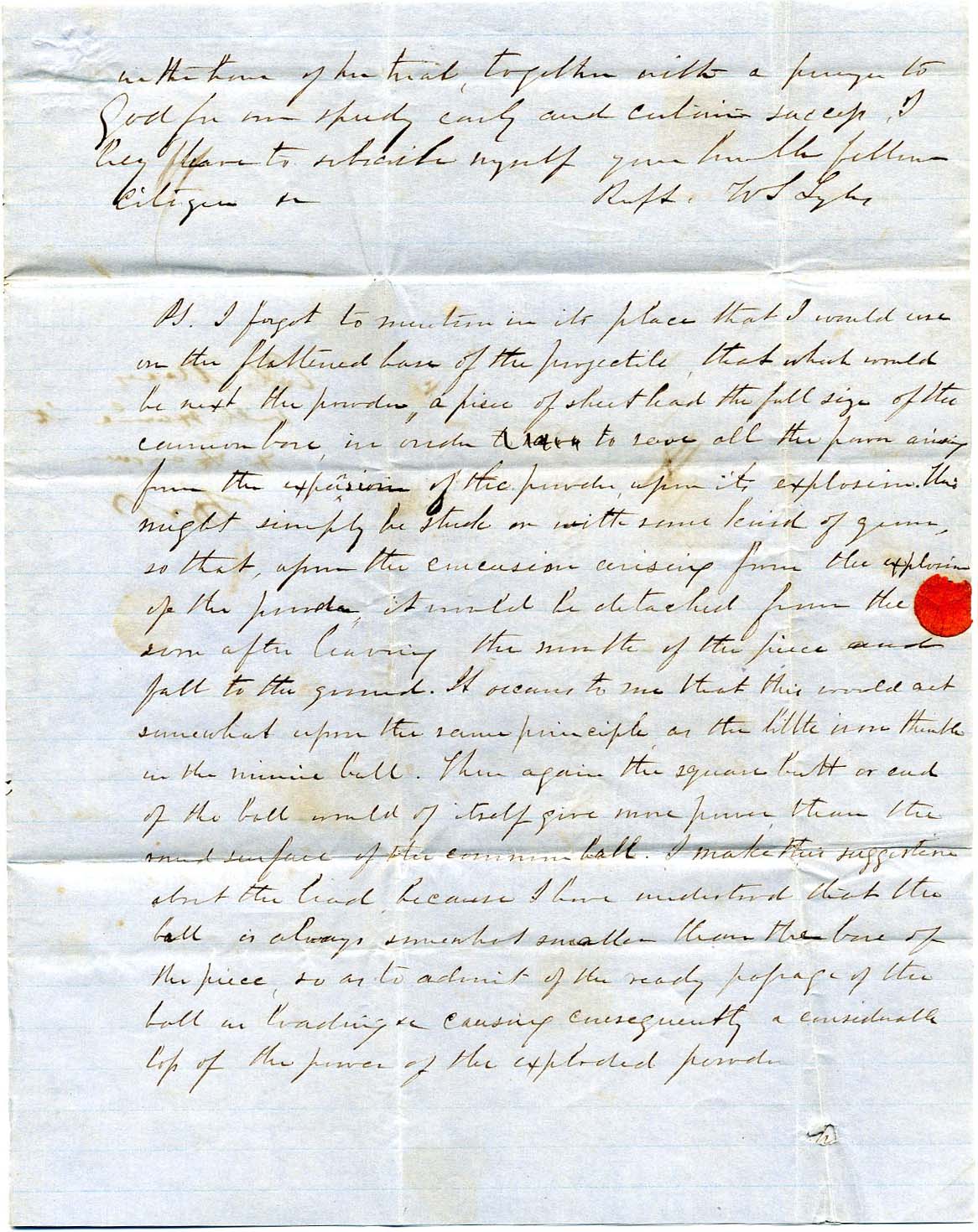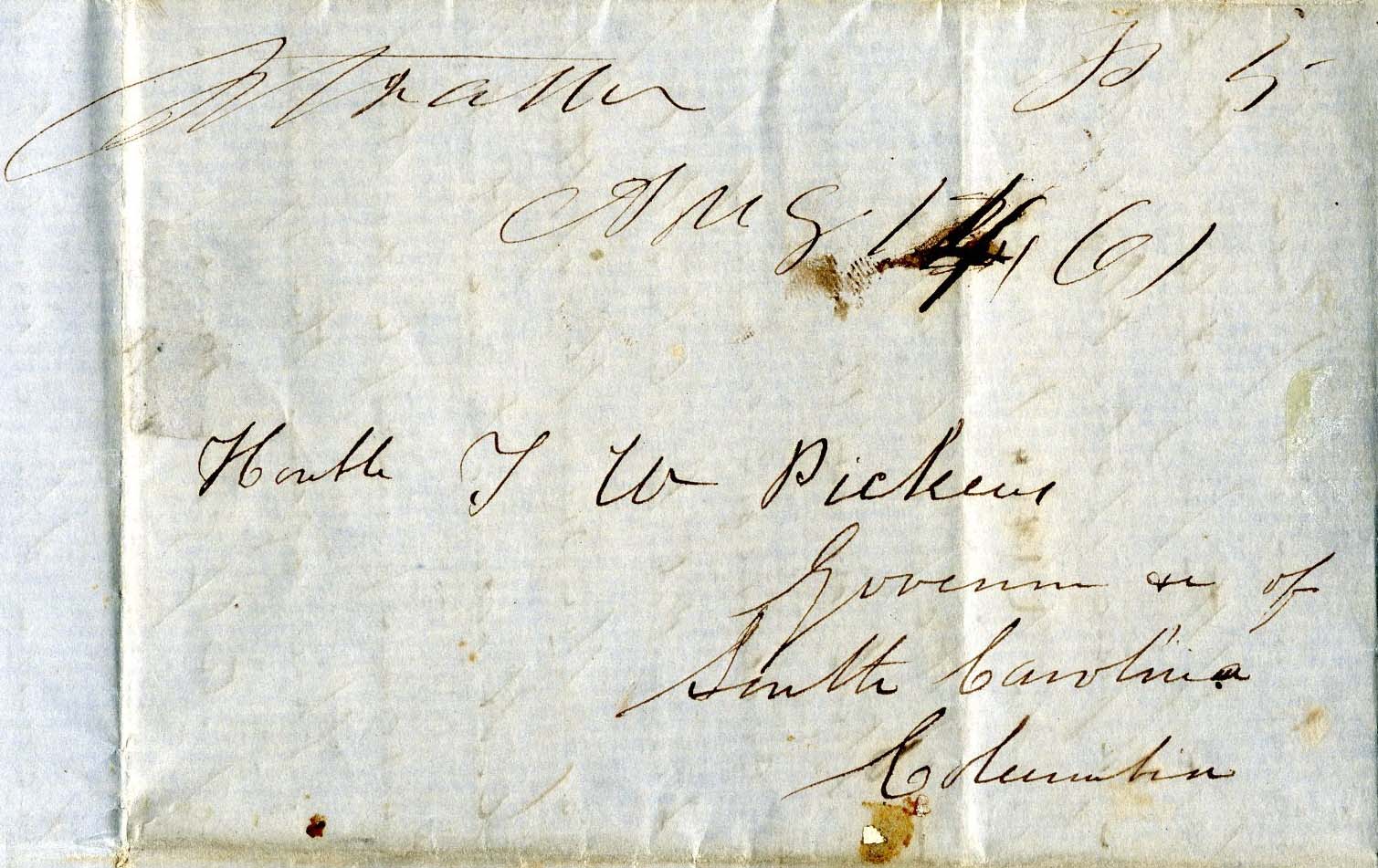 “Strother [SC] P 5 Aug 14 ‘61” (not so listed in CSA Catalog, “P 5” instead of listed “Pd 5) all in manuscript on 4-page folded letter to Honorable F. W. Pickens, Governor of South Carolina Columbia from William Strother Lyle who is confined at home with a spinal disease and spends most of the letter speculating on the subject of guns and arms in great detail, a very interesting read. The letter is one sheet folded to make four pages. It has a large Eagle watermark. Each of the four pages are 7.75” by 9.75 inches” and folded as mailed is 4.625” x 3.125.” $350.