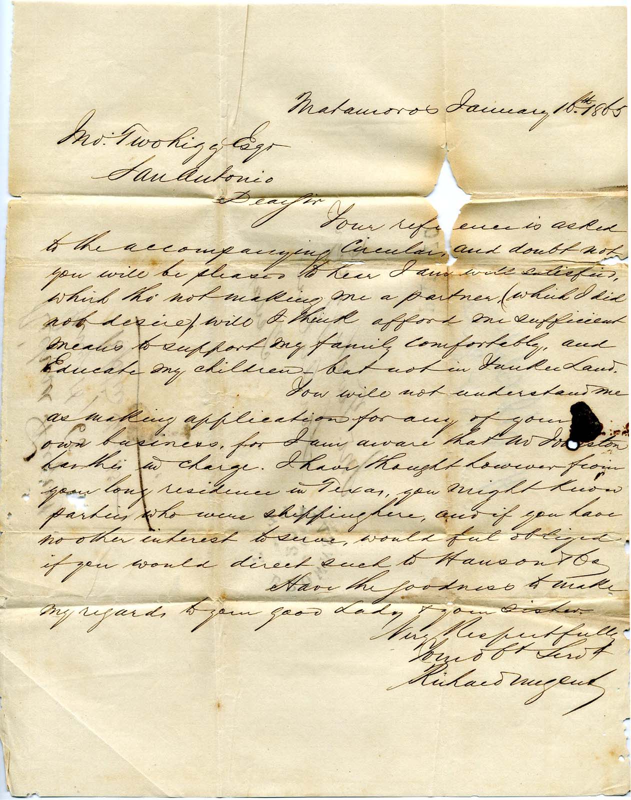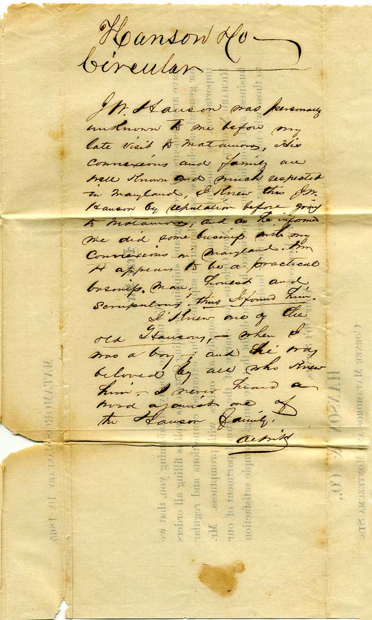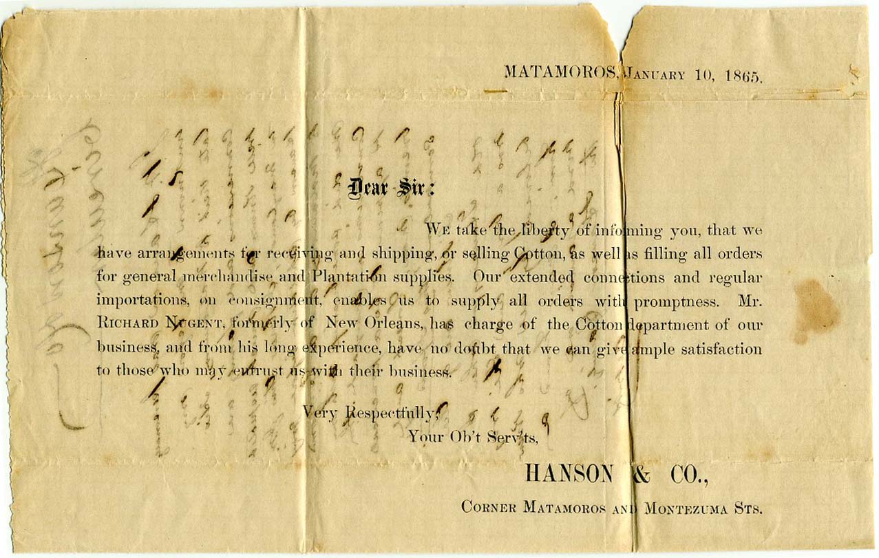 BROWNSVILLE / TEX // JAN / 20 [1865] rimless cds on CROSS-BORDER folded letter to Jno. Twohigg, Esqr., San Antonio, Texas, from Richard Nugent, headed “Matamoros, January 16, 1865” saying “Your reference is asked to the accompanying circular and doubt not you will be pleased to hear I am well satisfied which tho’ not making me a partner (which I did not desire) will I think afford me sufficient means to support my family comfortably, and educate my children but not in Yankee land.” Some internal tear and faults not affecting content. ORIGINAL PRINTED CIRCULAR headed “Matamoros, January 10, 1865.” from “Hanson & Co., Corner Matamoros and Montezuma Sts.” explaining that they have “made arrangements for receiving and shipping or selling Cotton, as well as filling all orders for general merchandise and Plantation supplies. Mr. Richard Nugent, formerly of New Orleans, has charge of the Cotton department.” On the back of the circular is written a letter highly recommending J. W. Hanson, who is well known and respected in Maryland. Nice TRANS-RIO GRANDE USE carried from Mexico. $1,100.