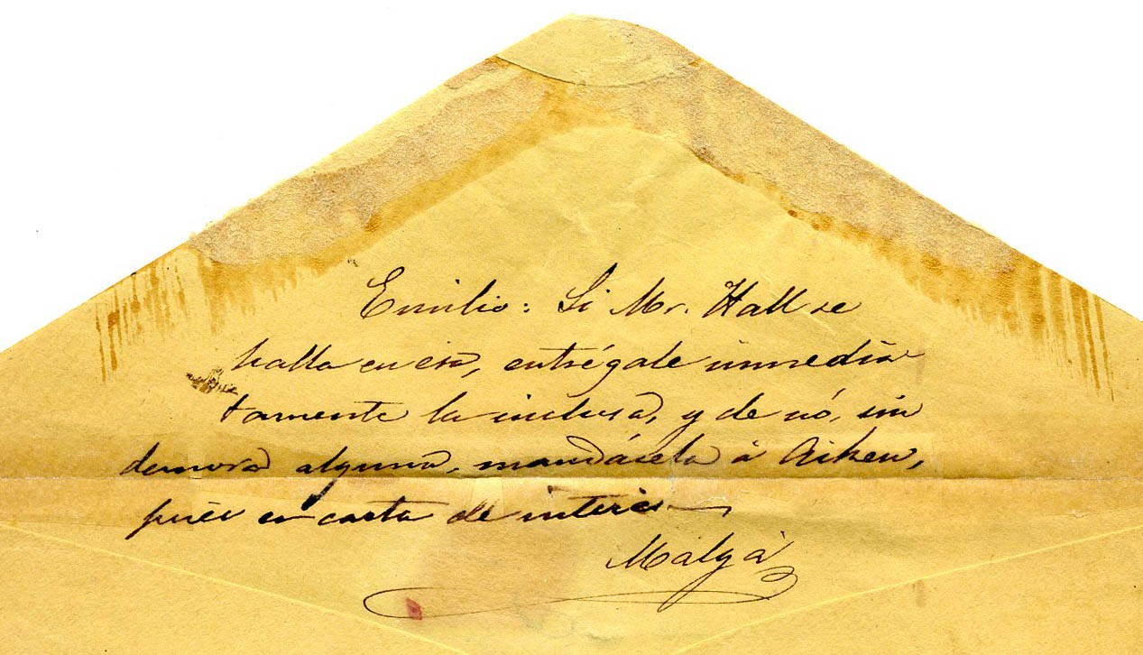 PRIZE COURT MAIL presented as evidence of a legal seizure of a blockade-runner. ANDERSON / S.C. // AUG / 26 [1861] with matching handstamped PAID 5, magenta manuscript court docket of “A No 7 / HHE” (Henry H. Elliot), the NEW YORK PRIZE COURT commissioner who initialed it as evidence in the case. This was one of the early prize court cases of the Civil War. Addressed to Emilio Puig, Esqr., Care of Spanish Consul, Charleston S.C. Puig was a Spanish citizen and prominent Catalán businessman who lived in Charleston and was involved in Prize Court cases both in 1861 and 1863. He more than once smuggled mail and important dispatches from Charleston to Cuba aboard blockade vessels. Under the back flap (flap reinforced with archival document tape) is a note in Spanish to Puig signed “Malga” translating, “Emilio, If Mr. Hall is in Charleston, deliver the enclosed letter to him immediately and if he is not, send it without any delay to Aiken, as it is an important letter.” Victor Malga was a cousin of Emilio Puig. V. Malga & Co. of Havana was in the import / export business and was connected with the W. P. Hall Co. Malga was a brother-in-law of Hall. Their companies were involved in shipping, maritime trade and blockade running in and out of Charleston during the Civil War. William Peroy Hall was born in Cuba in 1835 (1880 census). Highlighted in an article in La Posta https://www.trishkaufmann.com/files/1QLaPostaCW4.pdf and a longer article in the American Philatelist https://www.trishkaufmann.com/files/FINAL-April-Section-05-KAUFMANN-sm.pdf $4,000.