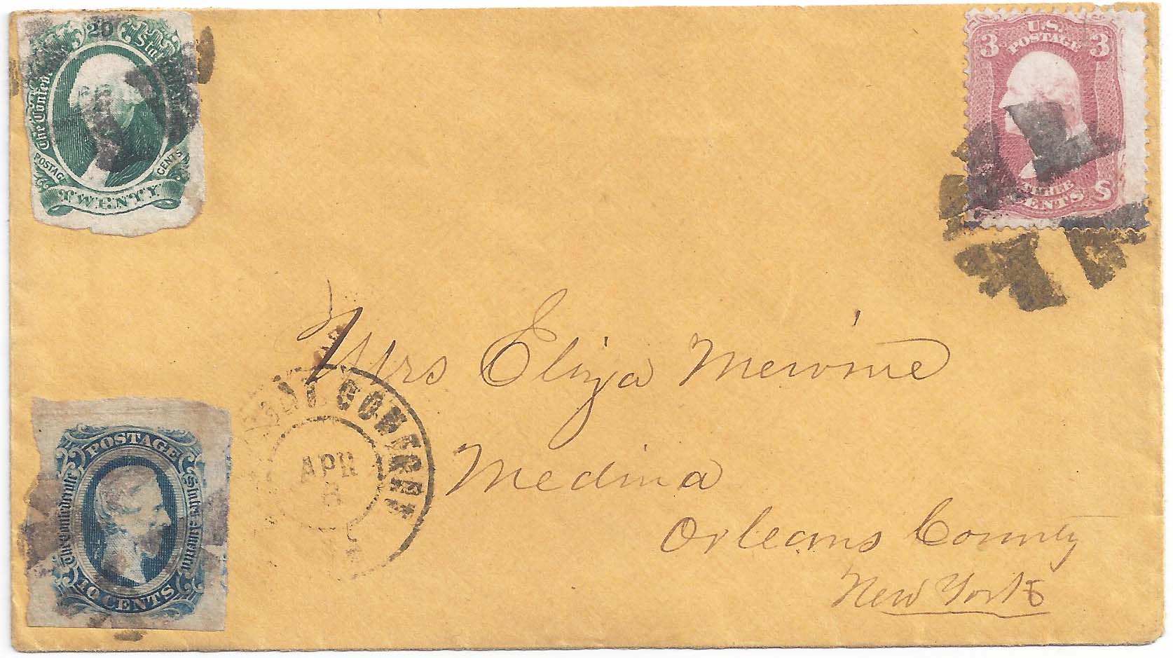 1862 July-Vedette Mail from Tucson to Los Angeles via Fort Yuma. Cover endorsed “Soldier’s letter, 1st Lt. J. P. Hargrave, Act. Adjt.” (Lt. Joseph Priestly Hargrave, Co. F, 1st Regiment, California Volunteers), addressed to Mrs. Clara S. Nye, Memphis, Michigan, in the hand of De Witt Vestal, carried by Vedette Mail from Tucson to Fort Yuma, then by another Vedette rider to Los Angeles where it entered mails with “Los Angeles Cal. Aug. 1” circular datestamp and “10” in oval due handstamp, which replaced the earlier device requiring manuscript rate, slight edge wear, still Very Fine. RARE VEDETTE MAIL COVER FROM UNION-OCCUPIED TUCSON IN MILITARY DISTRICT OF ARIZONA. Fort Yuma was the staging area for Union troops preparing to invade the Confederate territory of Arizona. Ex Birkinbine. VEDETTE MAIL is military mail carried by vedettes (French military term), defined as cavalry sentries or outpost pickets whose function was to relay information, give signals, warnings of danger, etc., to the main body of troops. Article on same in 4Q 2022 Civil War Philatelist. $1,400. Joseph Priestly Hargrave served in Co. F, 1st Regiment, California Volunteers. Clara Sutherland Nye was a widow who operated a millinery business. Much more detailed info on thumbnail-linked page. |