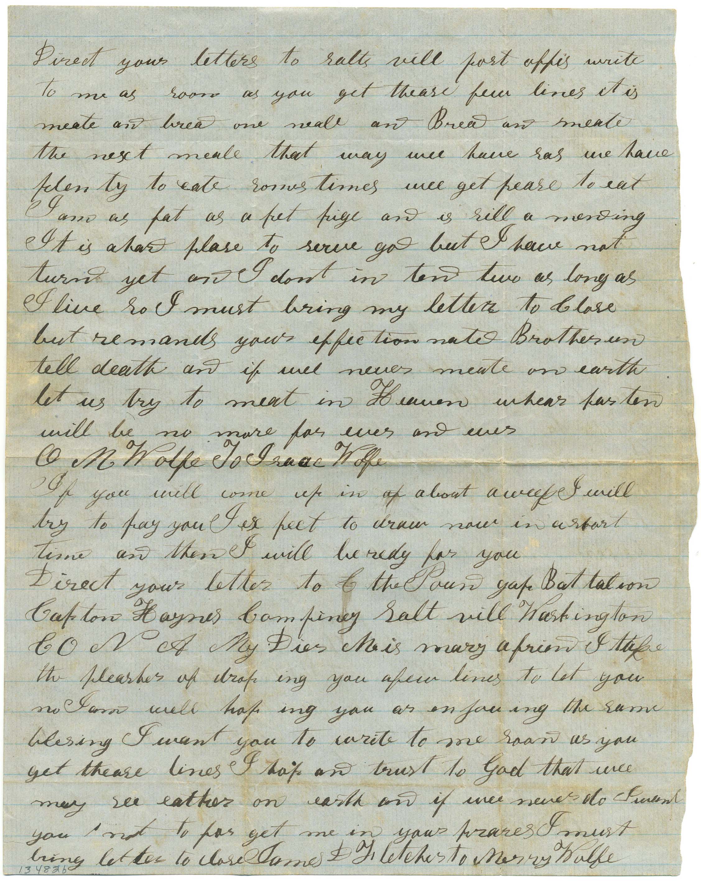 SOLDIER’S LETTER: “The South has gained a great victory at Richmond…” Smyth Co. Va June 30th 1862 headed 2-page 8” x 10” letter on blue lined paper to “Dier brother” by O. N. Wolfe to Isaac W. Wolfe and (on same sheets) James D. Fletcher to Merry Wolfe in Stock Creek, Virginia. Letter (uneducated spelling and grammar) sent from Saltville, Va., saying in part, “I take the time to tell you about the grate victory the South gas gained at Richmond, they have taken 43 Genrals and forty two or three peares of cannons and a good many Colonels and Privates…if this is true I hope peace will be made before much longer as I am tirde of all of this plase…have been through the rivers and now are just on the side of the salt mill, direct letters to Saltville PO.” Mentions that he is eating well and is mending (wounded)… “If we never meate on earth may be meat in heaven…Poun Gap Battalion, Captain Haynes Company…James D. Fletcher” (VA 21st Infantry). He refers to the battles of late around Richmond-Mechanicsville, First Cold Harbor, Gaines Mill-the Seven Days Battles. Excellent letter from North Carolina soliders stationed or recuperating at Saltville. $550.