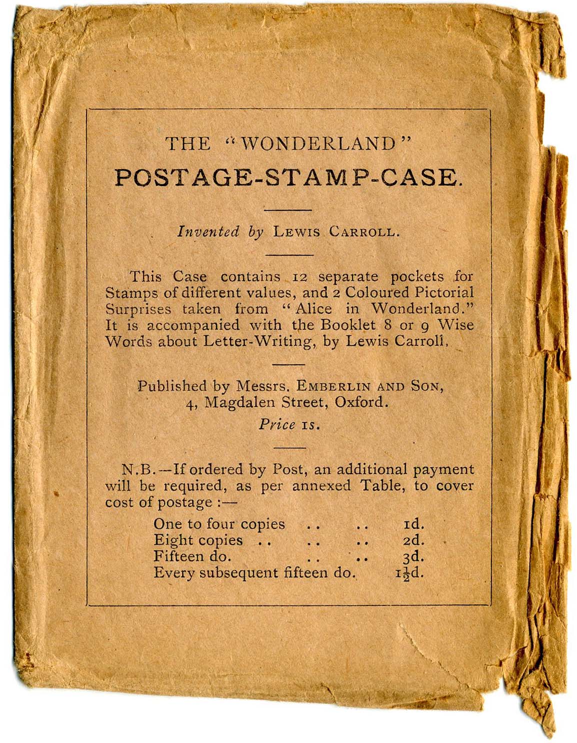 THE WONDERLAND POSTAGE-STAMP CASE by Charles Lutwidge Dodgson, better known as LEWIS CARROLL, published by Emberlin & Son, 1890 (but after 1907) Folded card, reinforced by cloth, designed to hold and protect stamps of various sizes, third edition. The case is decorated with select illustrations of Alice’s Adventures in Wonderland by John Tenniel; the case can be flipped so that the baby Alice holds in one image transforms into a pig, and the Cheshire Cat disappears. This image features the postage-stamp case, its cover, and Carroll’s 39 pp. pamphlet Eight or Nine Wise Words About Letter Writing, published 1907. Printed pink matching envelope (worn) included, stamp case clean and bright. A RARE AND SUPER COLLECTIBLE STAMP CASE AND PIECE OF CARROLLIANA. Very Fine. $500.
