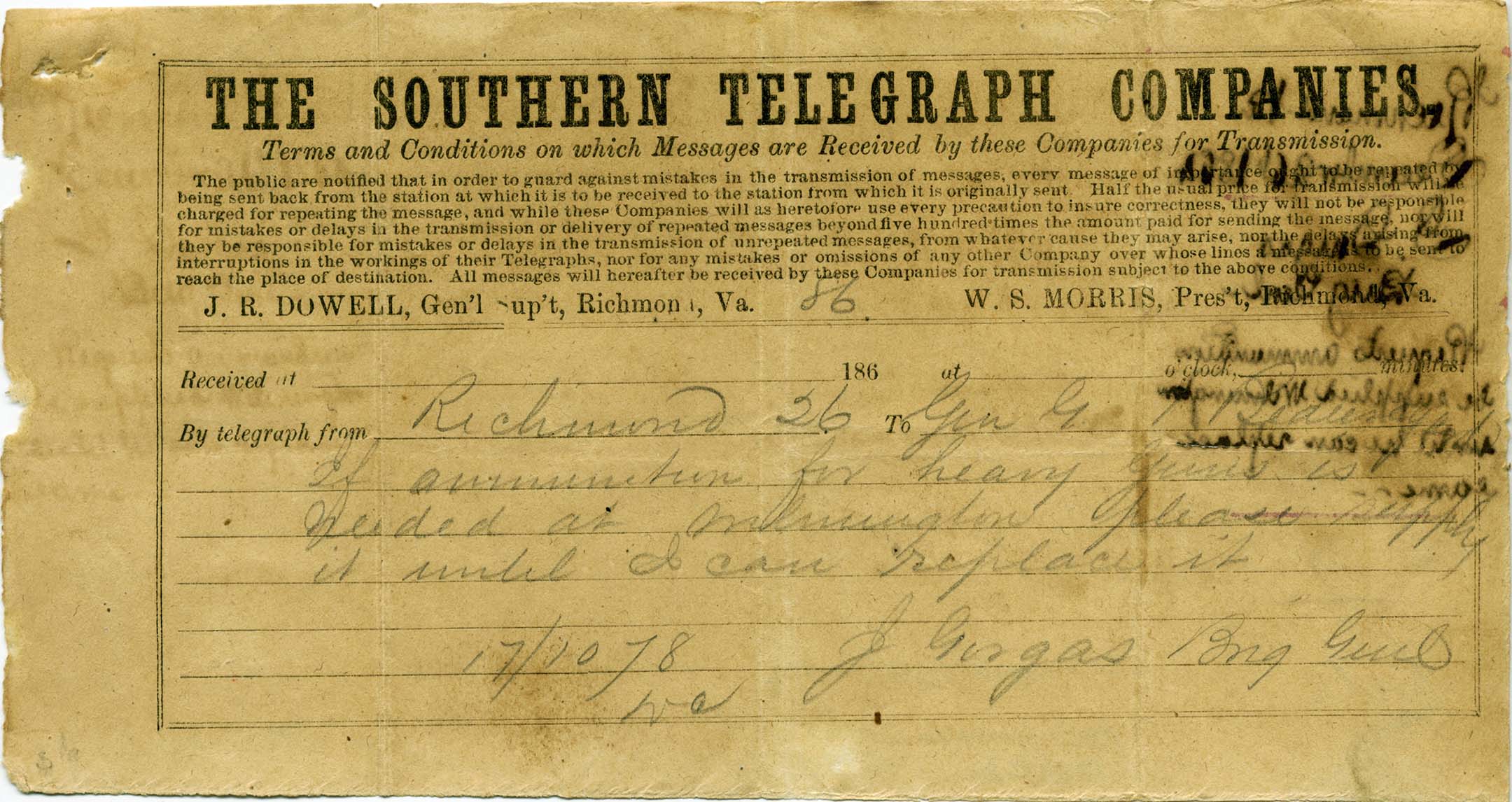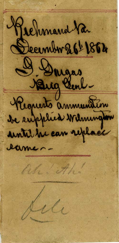 JOSIAH GORGAS: Two Gorgas items. 1) Manuscript Letter Signed on CSA War Department, Ordnance Office, Richmond, August 2nd 1861 dated imprinted letterhead to Gen’l Ira R. Foster, Quartermaster Gen’l State of Geo[rgia] Atlanta. Richmond, Va., July 21, 1861. (7.5” x 10”) in which Gorgas requests a lot of artillery haversacks, cap pouches and port-fin cases to be made for his troops. Letter, in the hand of a clerk, is signed “J. Gorgas” as Major & Chief of Ord[nance]. In 1864, he was promoted to Brigadier General. 2) Southern Telegraph Companies telegram (4 ¼” x 8”) dated Richmond, Va., December 26, 1864, from Brig. Genl. J. Gorgas to Gen. G. T. Beauregard in which he requests ammunition be supplied Wilmington until he can replace same. Both Gorgas items came from the collection of the late Judge Harry J. Lemley. A wonderful and scarce Gorgas duo. $1,200. Listed in both Miscellaneous-1 and Imprints, Section 2 LL
