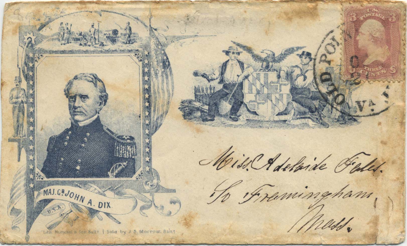 CHESAPEAKE HOSPITAL VA: Unsealed prisoner-of-war cover addressed to William Alexander Fewell at Chesapeake Hospital, Fortress Monroe, Va., a South-to-North use sent thru Fortress Monroe and Old Point Comfort. Mixed franking with Confederate postage paid by CSA 4, 5¢ blue, and U.S. postage paid by demonetized 3¢ dull red (26), both tied by OLD POINT COMFORT / VA. // JUL / 2 / [1862] cds. The address and other directives on the cover have been mostly erased and some of them re-written in non-contemporary pencil, the 5¢ stamp with toned spots. Despite the difficulty in deciphering what was originally written on the cover, extensive research by Galen Harrison and Jerry Palazolo offers conclusive evidence that this is a genuine South-to-North mixed-franking prisoner cover, accompanied by a UNION PATRIOTIC with a # 65 and the same Old Point Comfort circular datestamp (showing that this style was used during the period in question, cover heavily toned) and by several letters detailing the expertizing process as well as descriptions of the recipient, who served in the 1st Palmetto Sharpshooters, was wounded at Seven Pines and died at Chesapeake Hospital before this cover was received, with 2004 CSA certificate and extensive background information, Ex Schopp. LL $1,800.