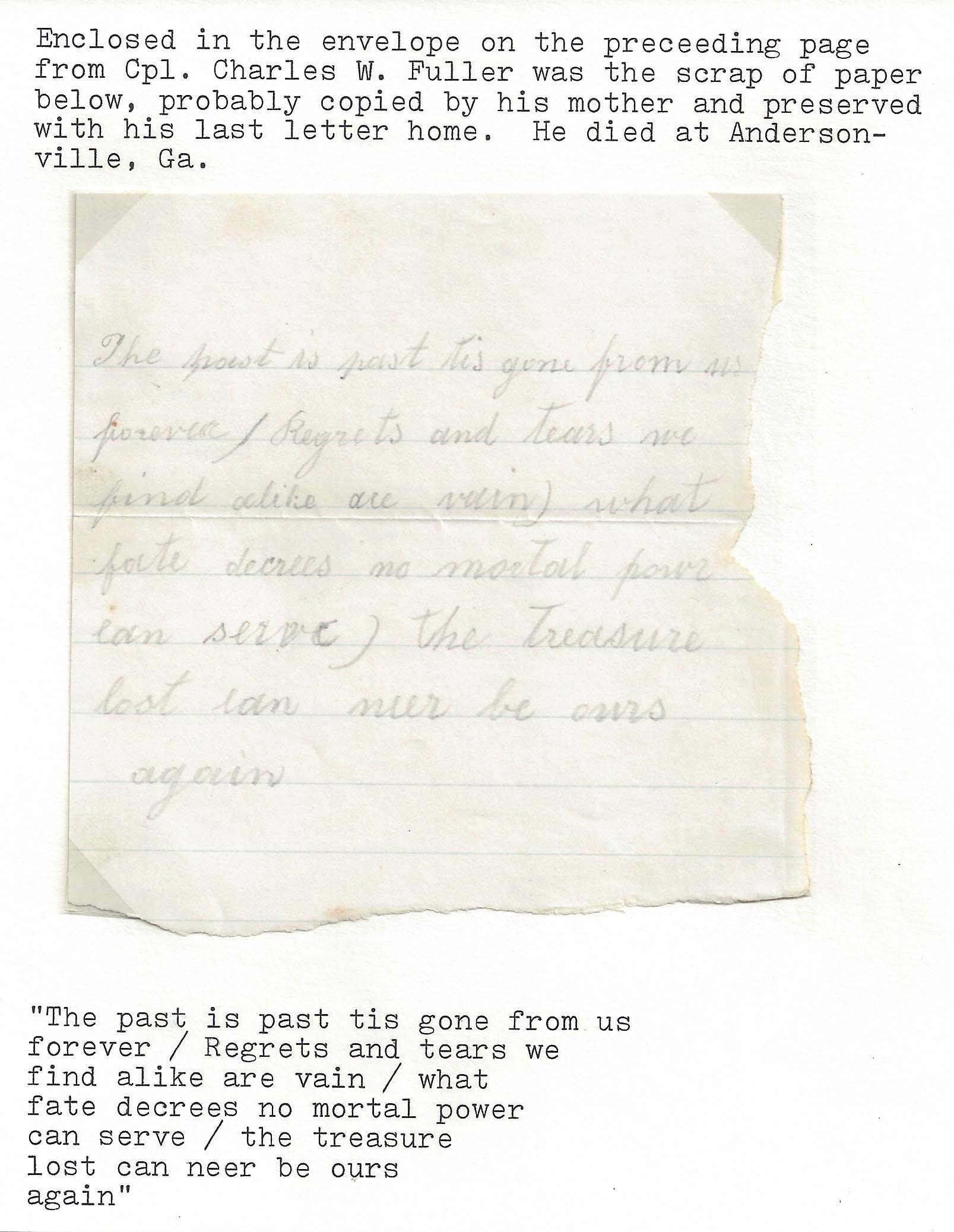 Cpl. Fuller died at Andersonville Prison. Enclosed with the cover was a small scrap paper, probably written by his mother and preserved with his last letter home, "The past is the past is gone from us forever / Regrets and tears we find a like our vain / what fate decrees no mortal power can serve / the treasure lost can neer be ours again." Click here to see this poignant note on piece of exhibit page.