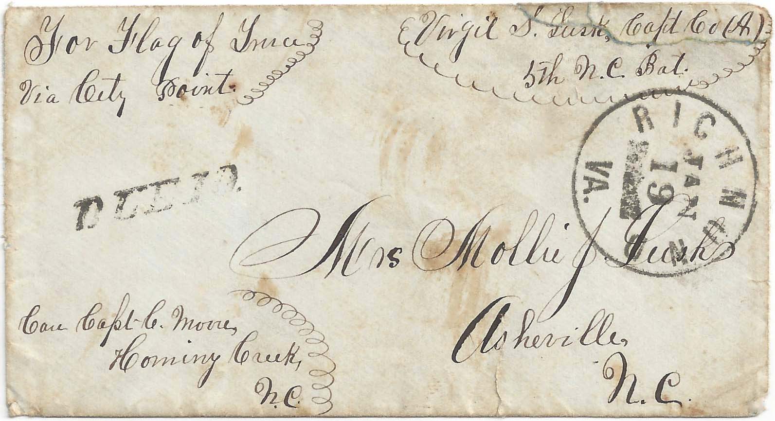 JOHNSON’S ISLAND, SANDUSKY, OHIO: North to South inner envelope posted with RICHMOND VA JAN 19 DUE 10 when it crossed the lines and the outer cover was discarded per regulations; manuscript directive at upper left “For Flag of Truce Via City Point” and mandated “Virgil S. Lusk, Capt. Co (A) 5th N.C. Bat.” to his wife “Mrs. Mollie J. Lusk, Asheville (Western) N.C. Care Capt. C. Moore Homing Creek, N.C.” Sealed tears at top and bottom. $250.