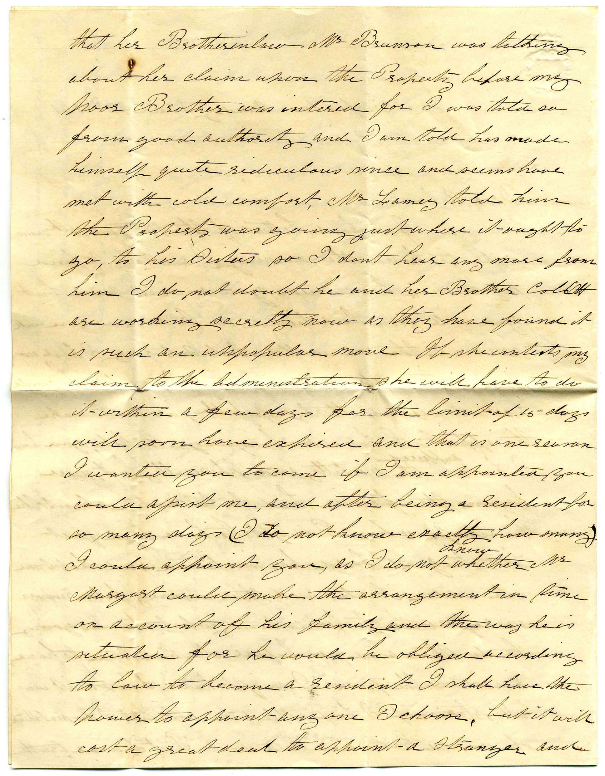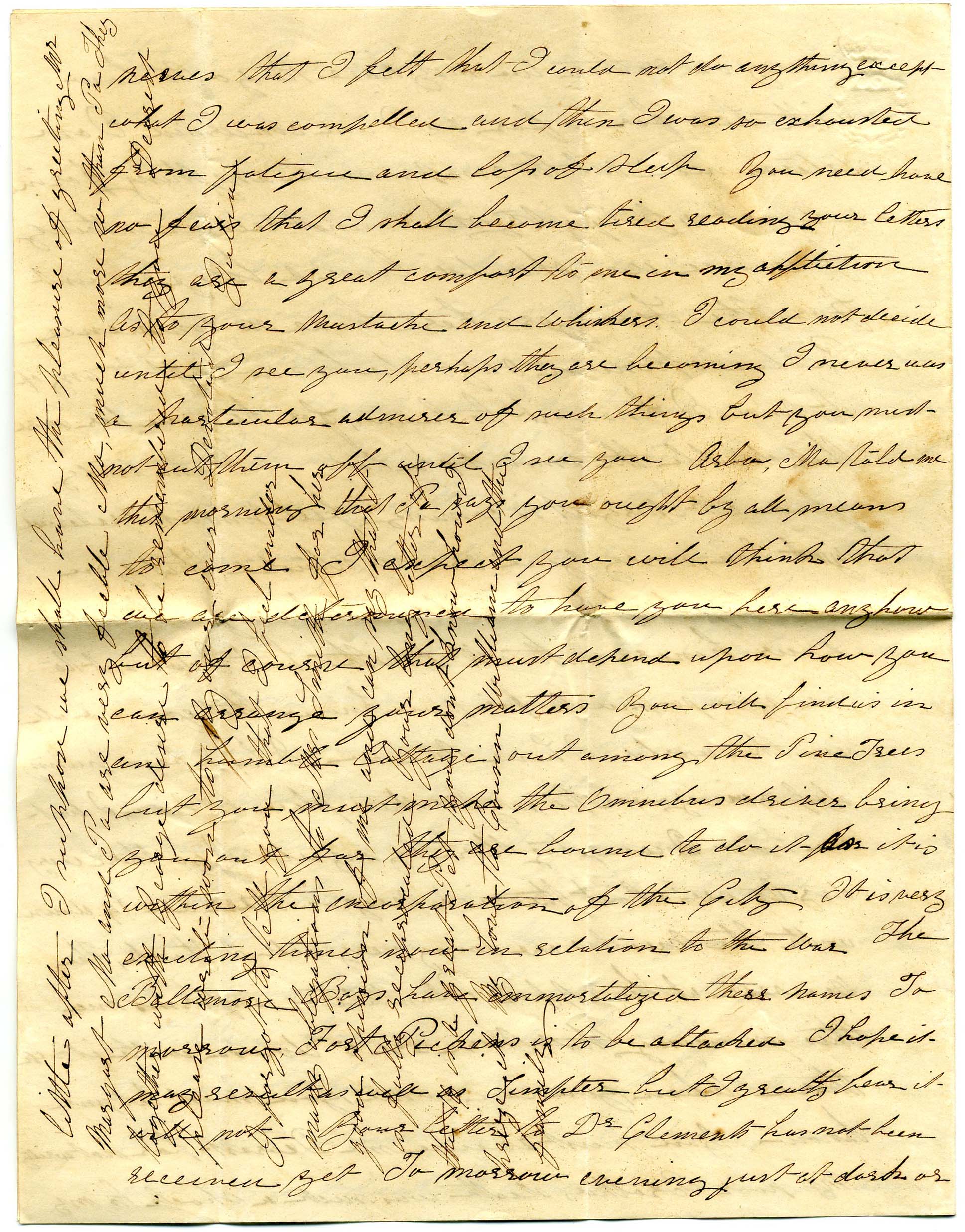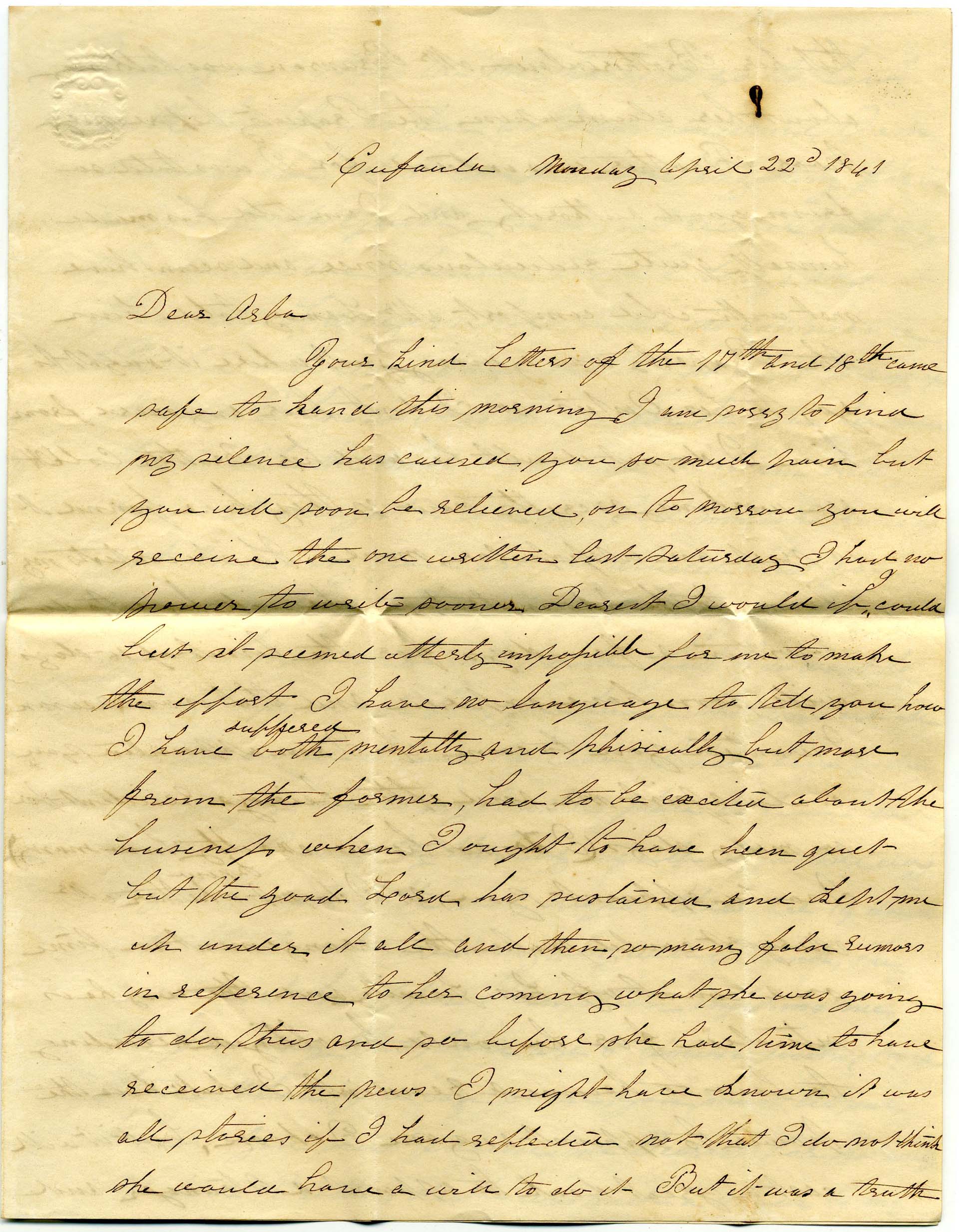 3¢ dull red (26) (lower left corner crease) tied grid and EUFAULA / Ala. // APR / 22 [1861] cds on small MOURNING COVER (4 ¼” x 2 ½”) to Arba Sternes, Columbia, SC, UNLISTED Confederate Use of U.S. Postage, 4-page letter from Julia Lowman dated the same day talking about relatives who are conspiring to lay claim to her late brother’s estate, which he has left in part to Julia’s son. She has bee putting off going to live at her brother’s plantation because 14 of the Negroes are down with the measles, but she checks on them every day. The overseer of the “Upper Plantation” tells her they are also 5 down with it up there. She says, “The Baltimore Boys have immortalized their name. Tomorrow Fort Pickens is to be attacked.” (Pensacola, Fla.) SOLD as part of the Sternes correspondence. Kept on the website to tell the story.