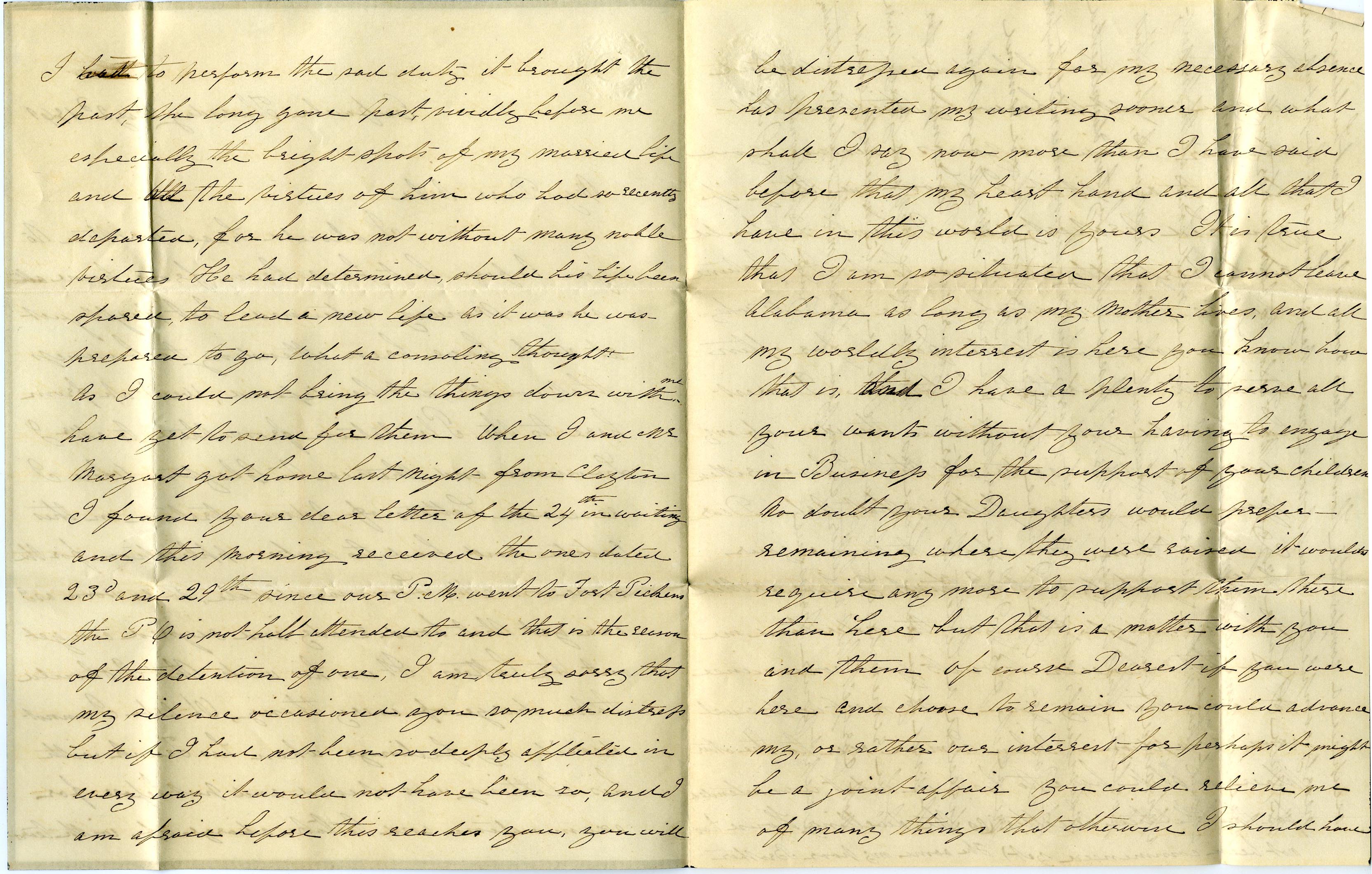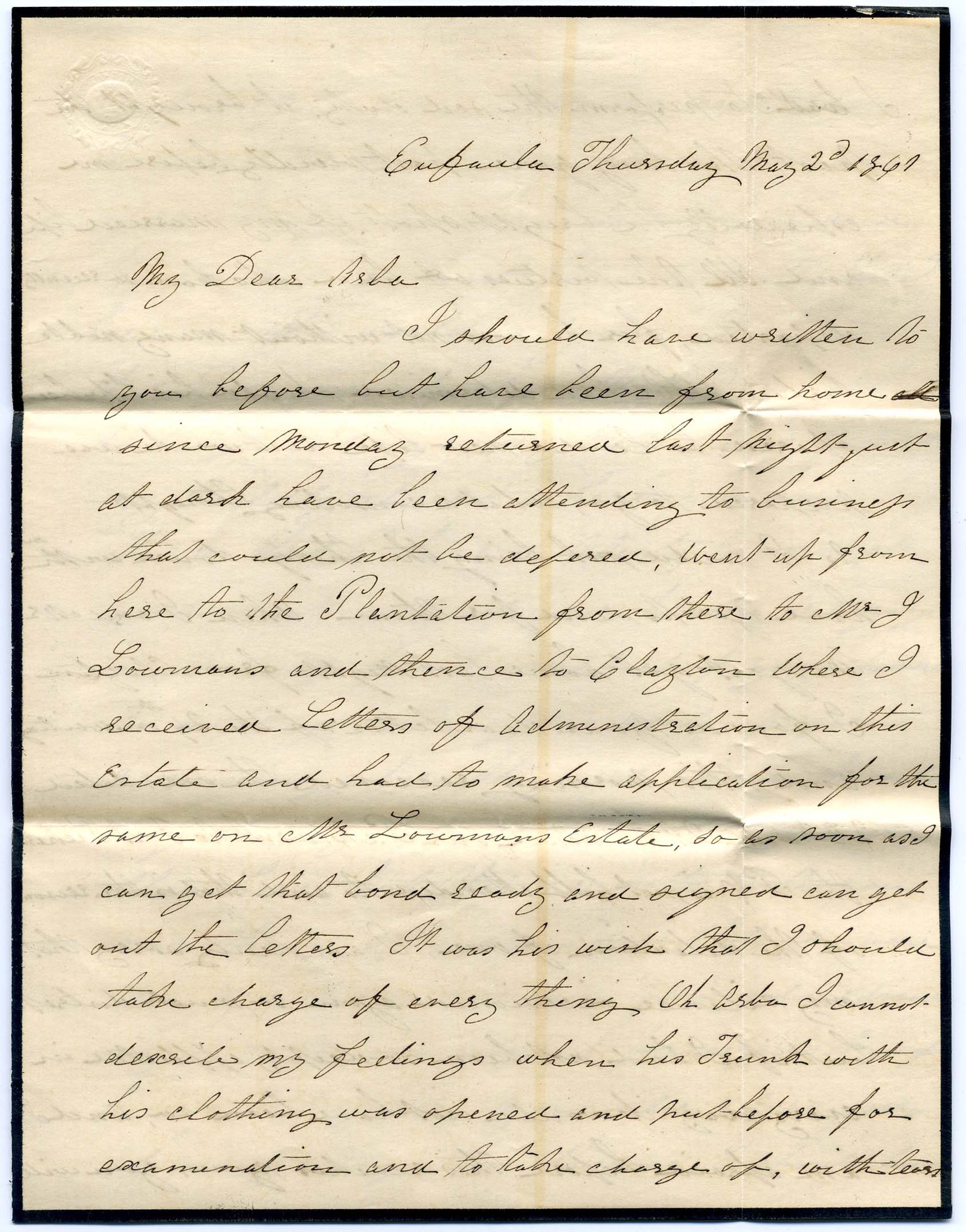 3¢ dull red (26) tied grid and EUFAULA / Ala. // MAY / 2 [1861] cds on small black-bordered MOURNING COVER (4 ¼” x 2 ½”) to Arba Sternes, Columbia, SC, UNLISTED Confederate Use of U.S. Postage, MATCHING MOURNING LETTERHEAD, 4-page letter dated the same day saying she has received letters of administration for her late former husband’s estate, her sadness at opening his trunk with personal effects, his wish that she take charge of his affairs upon his death, hoping he will move to Eufaula to be with her and more. Last page is cross-written, makes the missive 5 pages of content. Beautiful duo. SOLD as part of the Sternes correspondence. Kept on the website to tell the story.