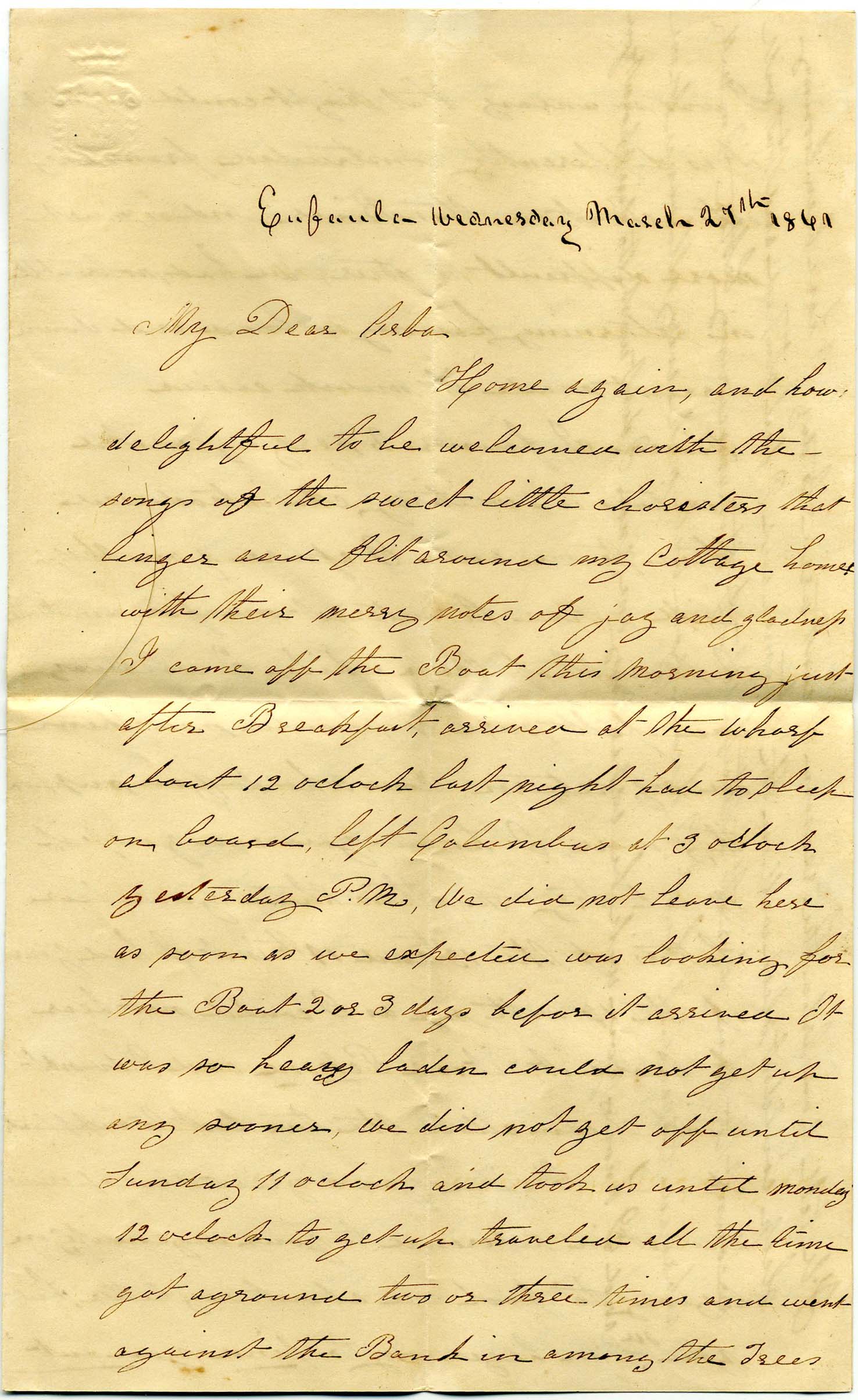 3¢ dull red (26) tied grid and EUFAULA / Ala. // MAR / 27 [1861] cds on small darling embossed laid-paper envelope (4 ¼” x 2 ½”) to Arba Sternes, Columbia, SC, UNLISTED Confederate Use of U.S. Postage, small 4-page letter to “My Dear Arba” from Julia Lowman, dated the same day. She mentions just getting off the boat from Columbus, it arrived for 2 or 3 days late, ran aground several times during her trip, etc. SOLD as part of the Sternes correspondence. Kept on the website to tell the story.