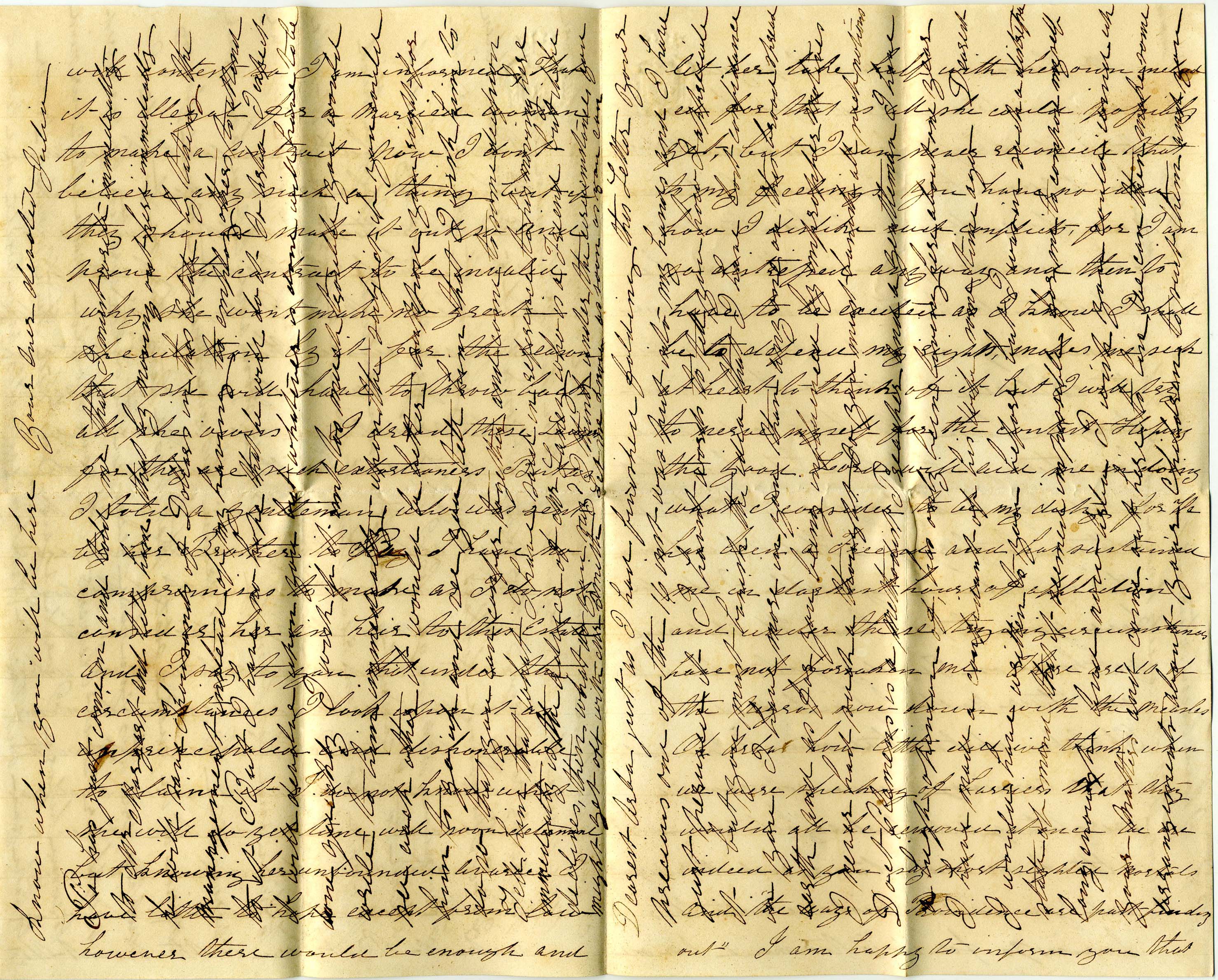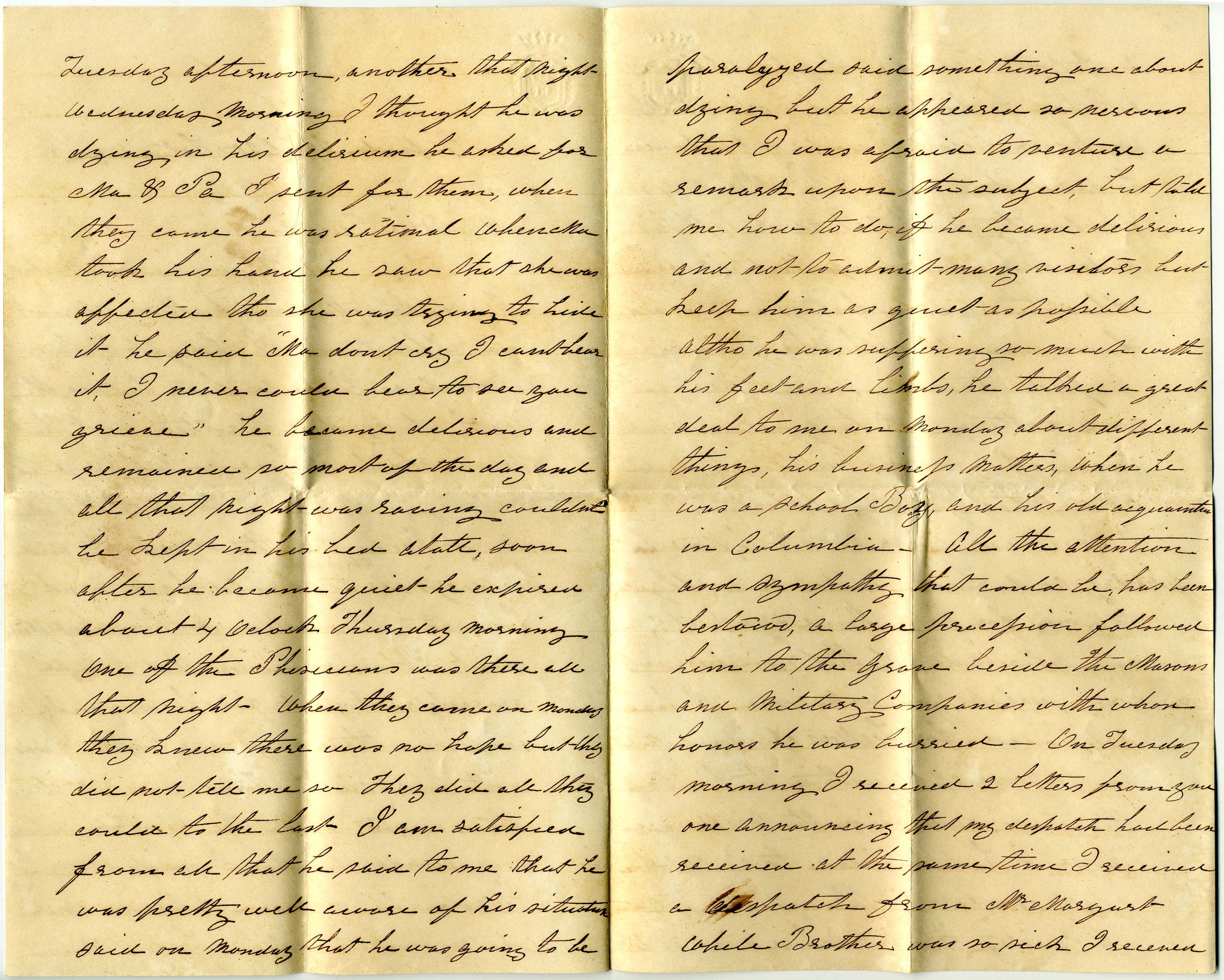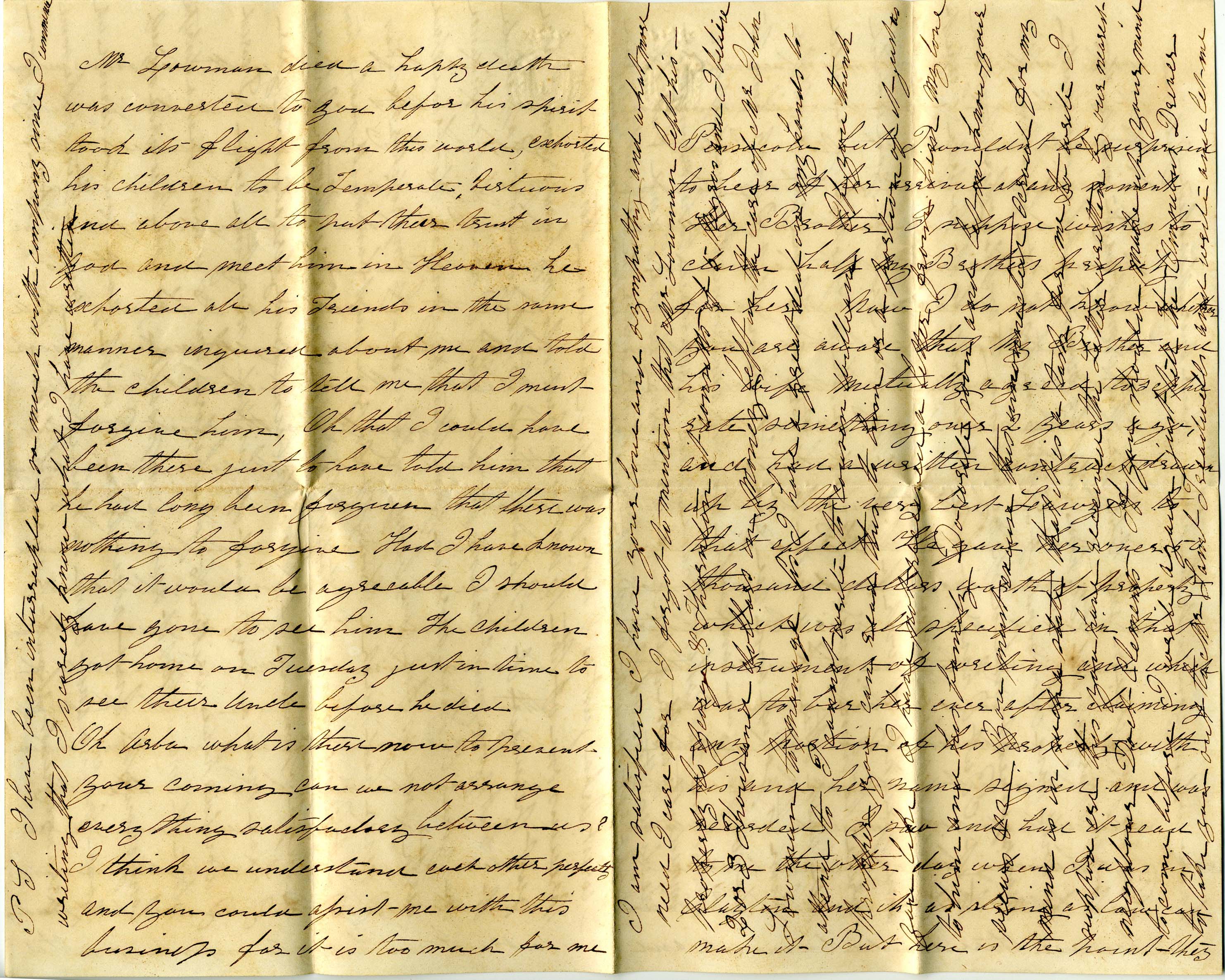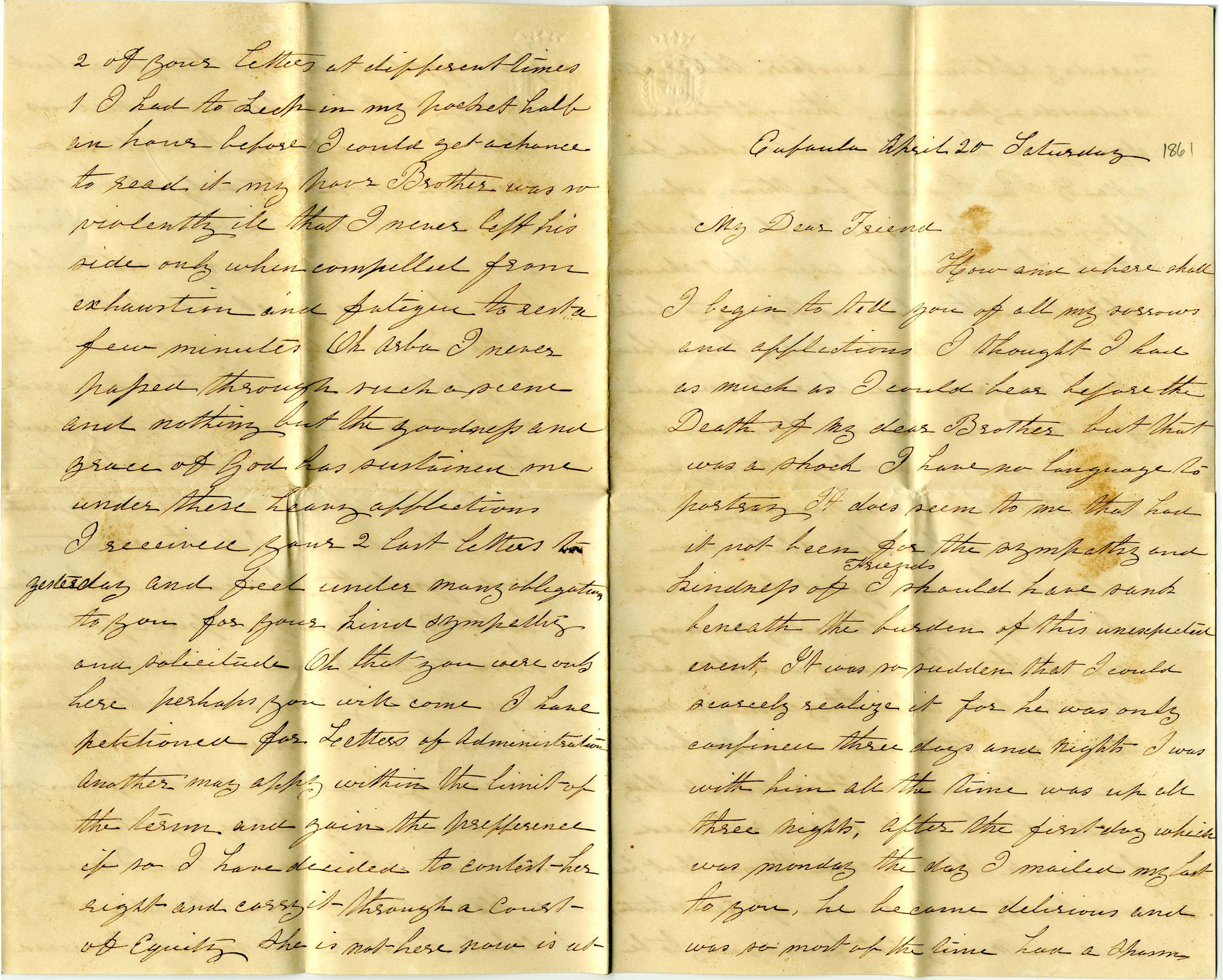 3¢ dull red (26) tied grid and EUFAULA / Ala. // APR / 21 [1861] cds on small black-bordered MOURNING COVER (4 ¼” x 2 ½”) to Arba Sternes, Columbia, SC, UNLISTED Confederate Use of U.S. Postage, heavy contents file fold at right; small 8-page letter to dated April 21 [1861] with Julia Lowman’s 8-page letter dated the evening before and relaying sad news of both her brother and divorced husband. At the lower left of the envelope is penned “In haste” and, indeed, the stamp was torn off at bottom and seemingly hastily affixed. She calls her brother’s death an “unexpected event,” but prior missives seem to belie that assertion. She notes that he was buried with full military and Masonic honors. Of perhaps even more importance to their relationship, she relays: “Mr. Lowman [her former husband] died a happy death, was converted to God before his spirit took its flight from the world, exhorted his children to be Temperate, Virtuous and above all to put their trust in God and meet him in Heaven. He exhorted all his friends in the same manner, inquired about me and told the children to tell me that I must forgive him. Oh, that I could have been there just to have told him that he had long been forgiven…the children got home on Tuesday just in time to see their uncle before he died…what is there now to prevent your coming? Can we not arrange everything satisfactorily between us? I am satisfied I have your love and sympathy and what more need I care for. I forgot to mention that Mr. Lowman left his property to George & Thornton (her sons by Lowman). It consists of 5 Negroes and I believe 2 or 3 Thousand dollars in money left in care of Mr. John Lowman to manage, as I have a great deal on my hands to attend to.” Thus, the tide seemed to be turning for their love-match, albeit by reason of sad events. Pivotal piece in this correspondence. SOLD as part of the Sternes correspondence. Kept on the website to tell the story.