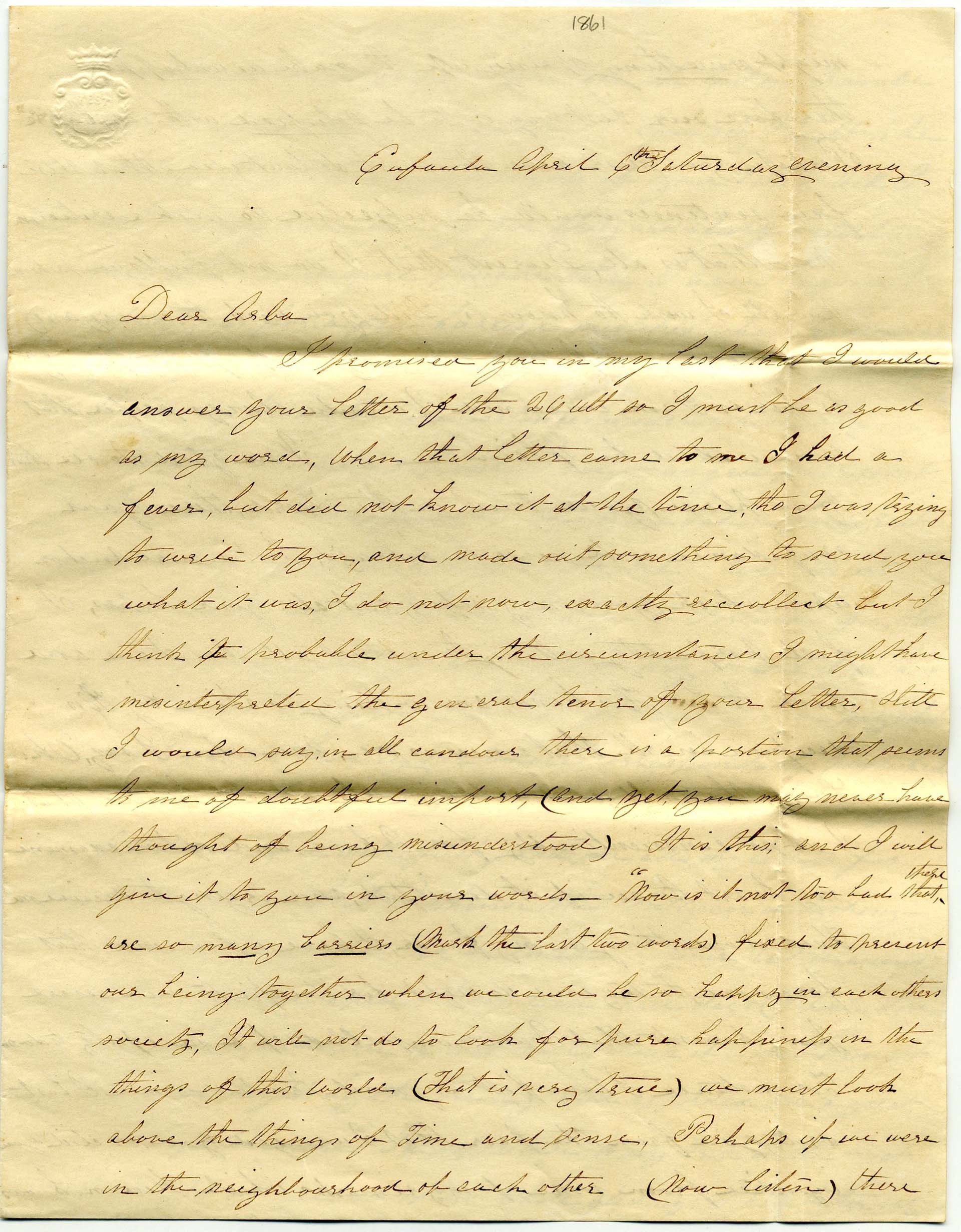 3¢ red star-die entire (U26) entire tied grid and EUFAULA / Ala. // APR / 8 [1861] cds, to Arba Sternes, Columbia, SC, UNLISTED Confederate Use of U.S. Postage, opening back flap tear extends over the top down through the postmark 1 ¾”. Enclosed two 4-page letters headed April 6 and April 8, in which she discusses the barriers to their romance. Mentions getting his letter in only 3 days so thinks there has been an alteration to the mail and must be going by train. Also, “…an Army of 8 hundred men came up the river from below yesterday bound for Pensacola by the way of Columbus and Montgomery. There was 500 on one Boat and 300 on another…tell me if Fort Sumter is abandoned, for we have so many fake rumors (“fake news,”Civil War style)” SOLD as part of the Sternes correspondence. Kept on the website to tell the story.