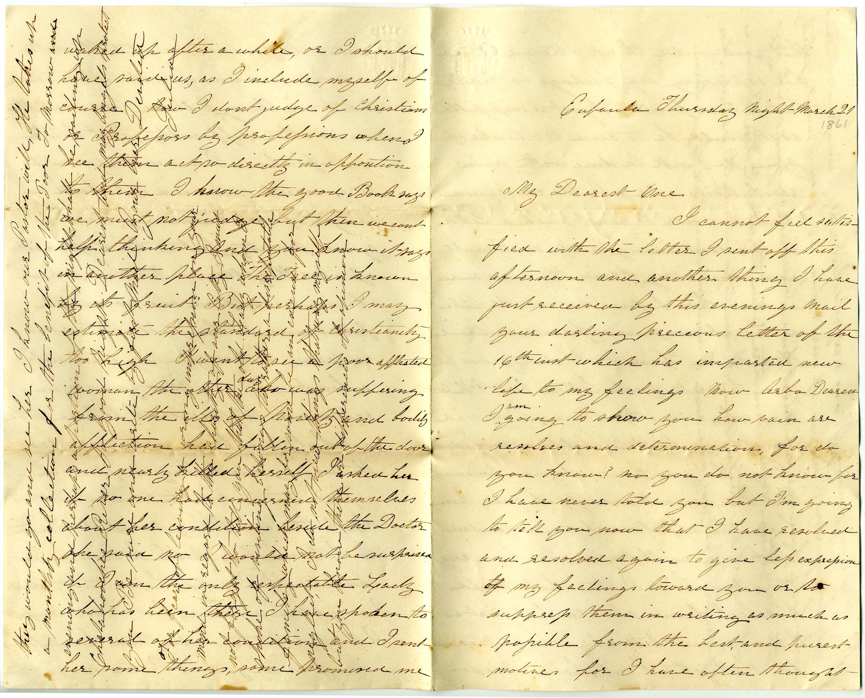 3¢ dull red (26) used with grid (stamp replaced) and EUFAULA / Ala. // MAR / 22 [1861] cds on UNLISTED Confederate Use of U.S. Postage, top back flap missing, pale green lined envelope with small stain at top, 4-page letter plus cross-written half page, headed Eufaula March 21 [1861]. SOLD as part of the Sternes correspondence. Kept on the website to tell the story.