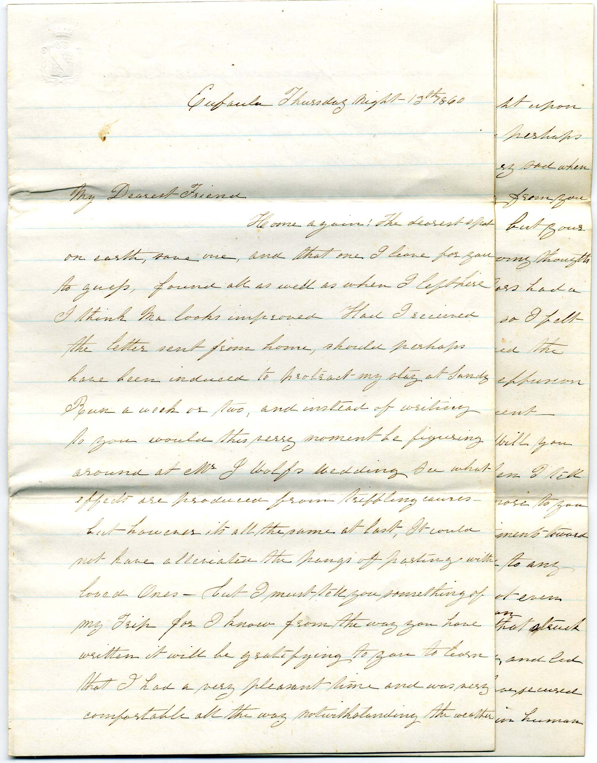 3¢ red Nesbitt entire (U11) tied grid with EUFAULA / Ala. // DEC / 14 [1860] cds, to Arba Sternes, Columbia, SC, 1” sealed tear at left edge, most of top back flap missing, 8-page letter from Julia Lowman. She says, in part, “…a few moments after you took leave of us at the Depot I raised my head to look at George, and to my surprise his face was suffused with tears, and he almost sobbed audibly. I said, what is the matter, do you hate so much to part with Mr. Sternes? He answered, yes Ma, don’t you? …I have acknowledged more to you or in other words expressed sentiments toward you that I never in all my life did to any gentleman, not one, except, no, not even the fine looking dashing young man that struck my youthful fancy, won my hand, and led me to the altar, and who might have secured the affection of as warm a heart as once pulsated in human breast had he not proved so unworthy.” Written one week before South Carolina seceded from the Union. SOLD as part of the Sternes correspondence. Kept on the website to tell the story.
