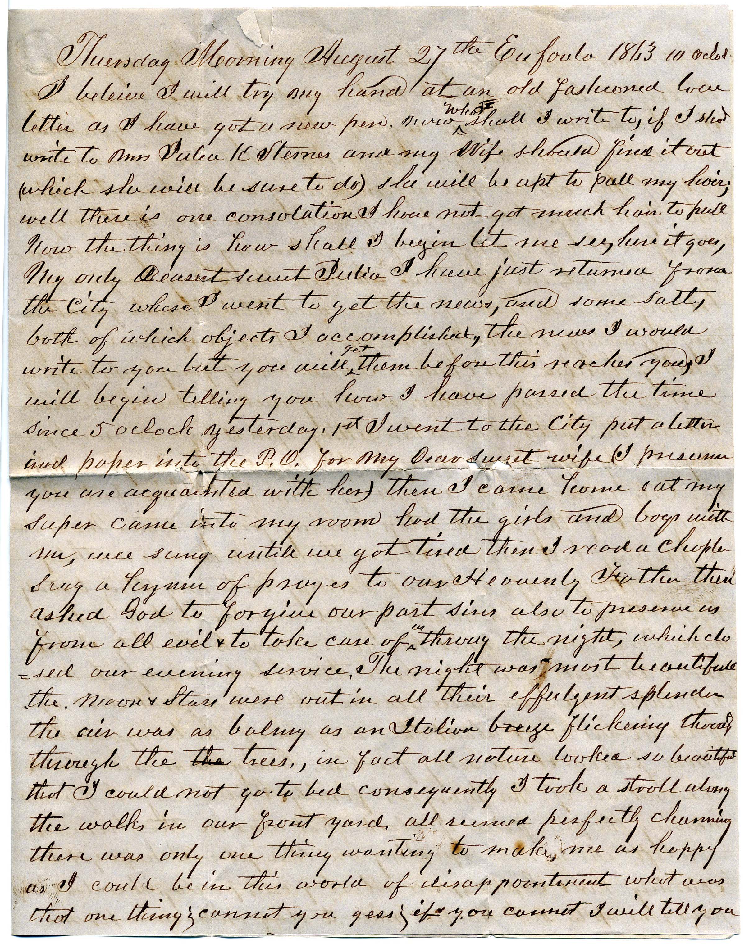 CSA 12a, 10¢ bright blue (small edge faults) tied EUFAULA / Ala. // AUG / 28 [1863] cds on cover to Mrs. Julia K. Sternes, care John C. Thornton, Esq., Fort Valey (sic), Georgia. Enclosed 4-page letter headed August 27th at Eufaula, sent by husband Arba in which he mentions news from SC (his former home) saying, “Fort Sumter is a pile of ruins but Col. Rett (sic) says he will remain there as long as there is a brick for him to stand upon and the Yankees will have to take the ruins at the point of the sword.” SOLD as part of the Sternes correspondence. Kept on the website to tell the story.
