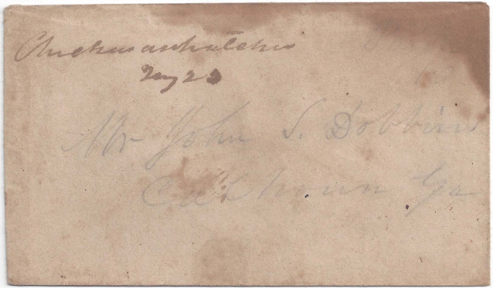 “Chickasawhatchie (Ga.) Jany 23 (1862)” manuscript postmark with matching “Paid 10.” Very obscure use from a small town in Lee County. Addressed to John S. Dobbins, Calhoun, Ga. Edge stains across top. $130.