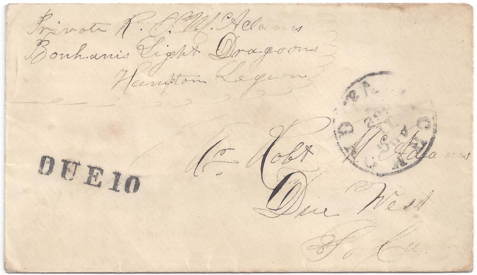 RICHMOND Va. SEP 5 1862 circular datestamp, Powell type 3e with matching DUE 10, type Q, on cover to Robt McAdams Due West So Ca. with soldier’s endorsement of Private R. O. McAdams Bonham’s Light Dragoons Hampton Legion (Army of Northern Virginia) on commercially made envelope. Ex Harry Muldrow. $110.