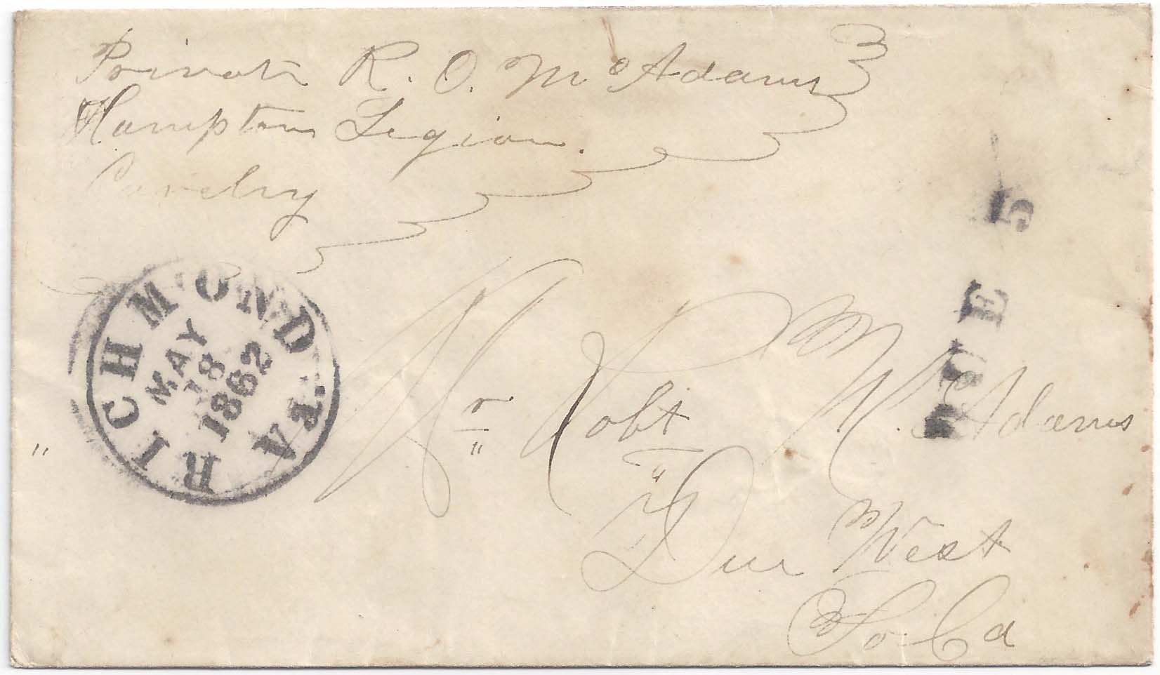 RICHMOND Va. MAY 18 1862 circular datestamp, Powell type 3a with matching DUE 5, type O, on cover to Robt McAdams Due West So Ca. with soldier’s endorsement of Private R. O. McAdams Hampton Legion Cavalry (Army of Northern Virginia) on commercially made envelope. Ex Harry Muldrow. $150.
