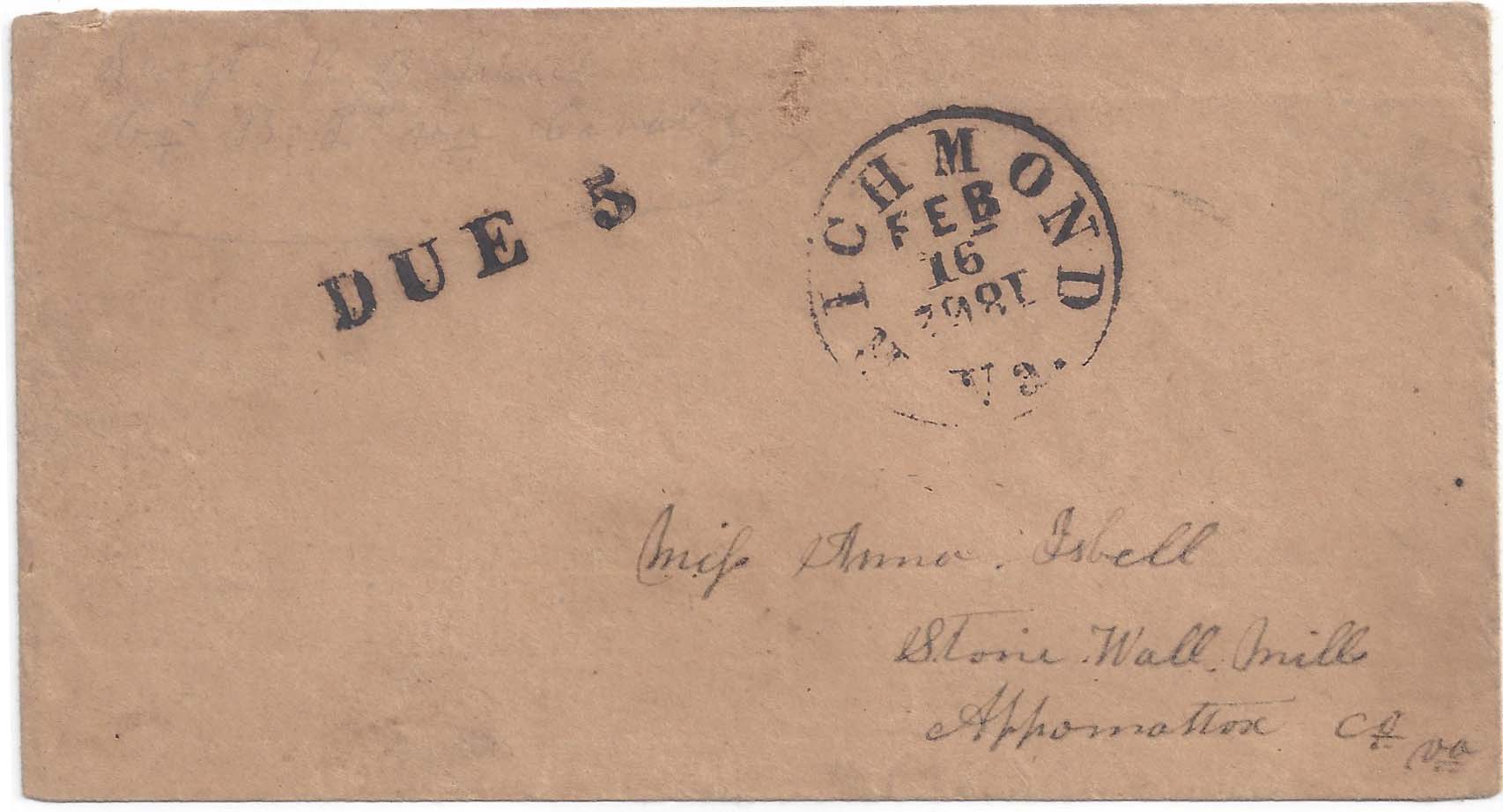 RICHMOND Va. FEB 16 1862 circular datestamp, Powell type 3a3 with inverted year logo with matching DUE 5, type O, on cover to Miss Anna Isbell, Stone Wall Mills, Appomattox CH, Va. Soldier’s pencil endorsement at top from Sergt R.B. Isbell, Co. B 2nd Virginia Cavalry. Small hole cut out of top back flap; tiny abrasion hole at top center. Ex Harry Muldrow. $100.