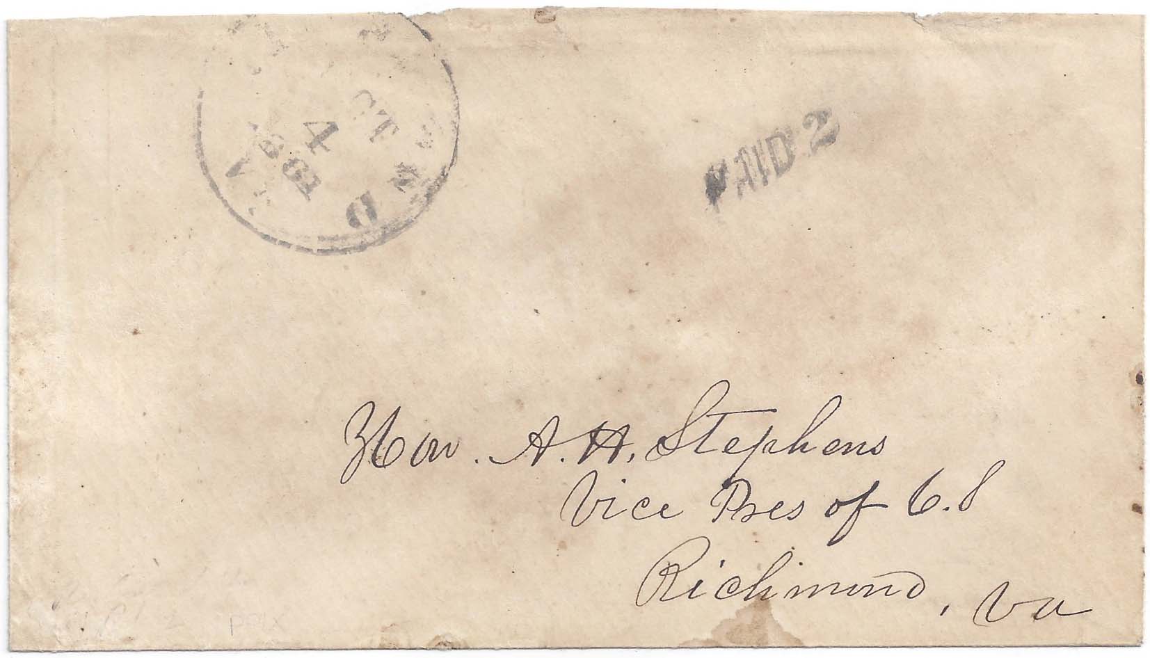RICHMOND VA OCT 4 1861 circular datestamp, Powell type 2c, with matching bold PAID 2 (type B, CCV $500) on cover to Hon. A.H. Stephens, Vice Pres of C.S. Richmond, Va. top back flap missing as usual with this correspondence; secretarial docketing indicating the sender was James F. Brown who has tendered his resignation and hopes Mr. S. will use his influence to see that it is accepted by the War Department. Ex Harry Muldrow. $250