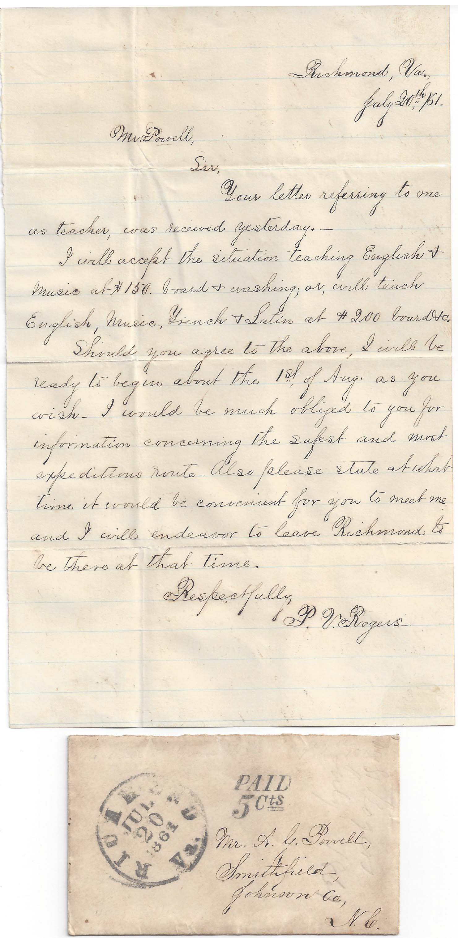 RICHMOND Va. JUL 20 1861 circular datestamp (Powell type 1a) with matching PAID 5Cts. (type F) on tiny commercially made envelope to Mr. A.G. Powell, Smithfield Johnson Co. N.C. with original letter signed P.V. Rogers regarding a teaching position and appropriate compensation for different subjects taught. If in agreement, he would be willing to start August 1. Late use of this postmark. Top back flap missing. Ex Harry Muldrow. $150.