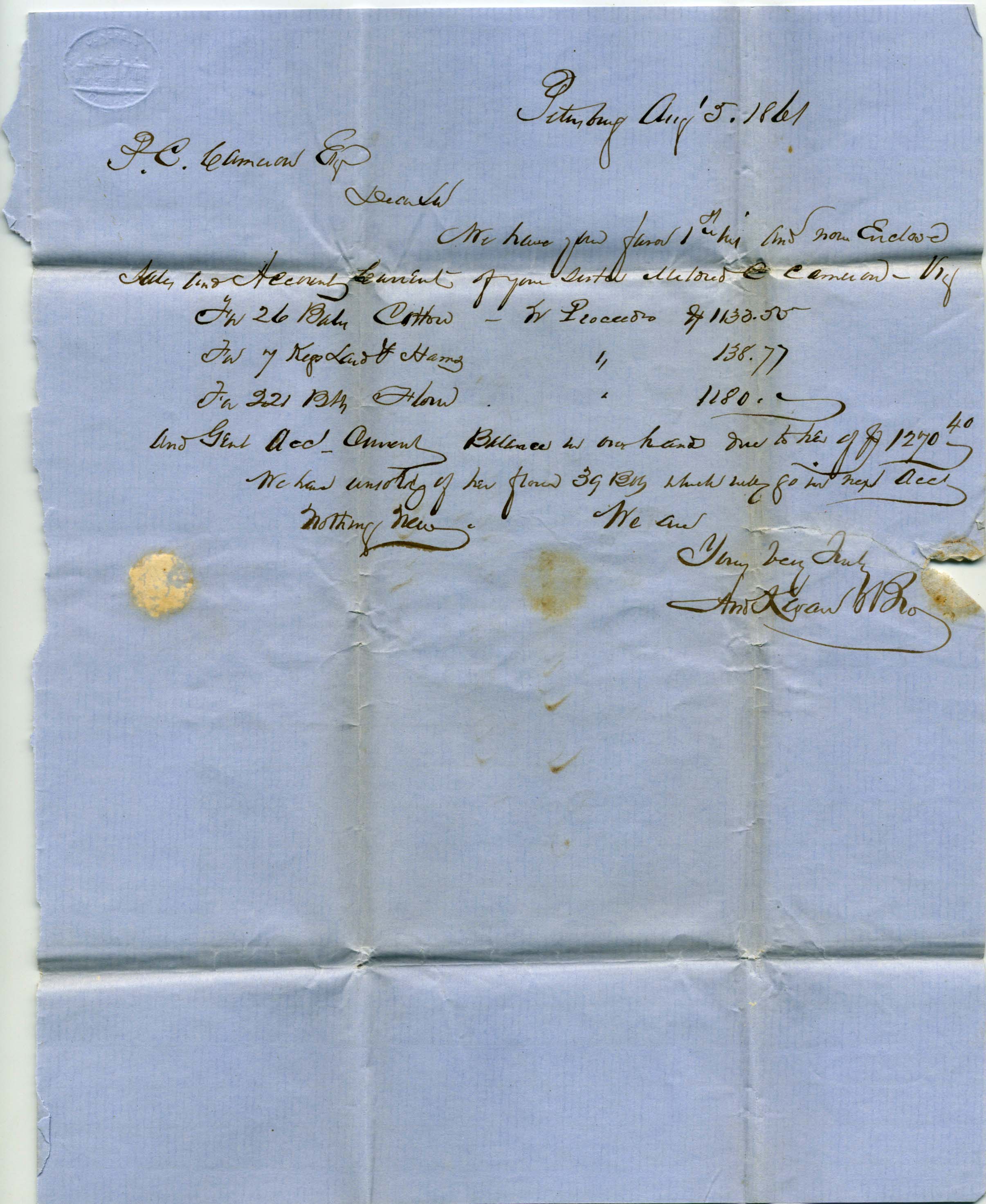 PETERSBURG Va. // AUG / 6 [1861] blue cds and matching PAID 10 (type D, CV $300) on folded business LETTER to P.C. Cameron Esq. Company Shops P.O. No Carolina from Jno. Kevan & Bro. regarding cotton and flour order. Ex Kathleen Staples. $250.