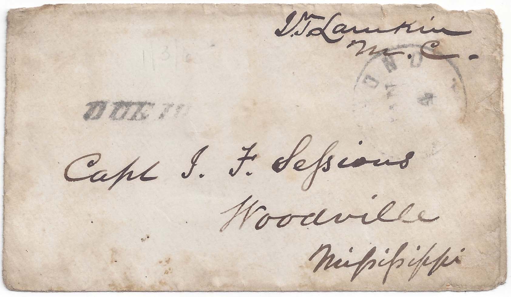 RICHMOND Va. JAN 4 (1865) circular datestamp (Powell type 6p) with matching DUE 10 (type P) on cover to Capt. J.F. Sessions, Woodville, Mississippi, with Member of Congress signature at upper right of “J.T. Lamkin M.C.” Open on 3 sides and some soiling. Scarce Member of Congress Due from Mississippi congressman. Ex Harry Muldrow. $250.