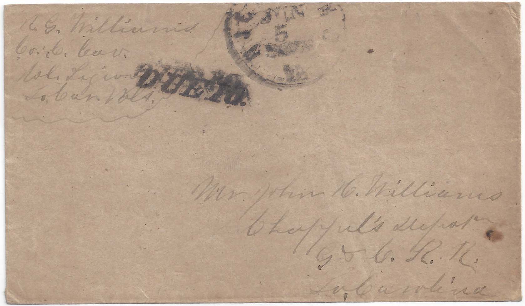 RICHMOND Va. JUN 28 (1864) circular datestamp (Powell type 6L) with matching DUE 10 (type P) on cover to John H. Williams, Chappel’s Deport G & C.R.R. So. Carolina. Mandated soldier’s endorsement R.G. Williams, Col. Legion S. Car. Vols. Ex Harry Muldrow. $90.
