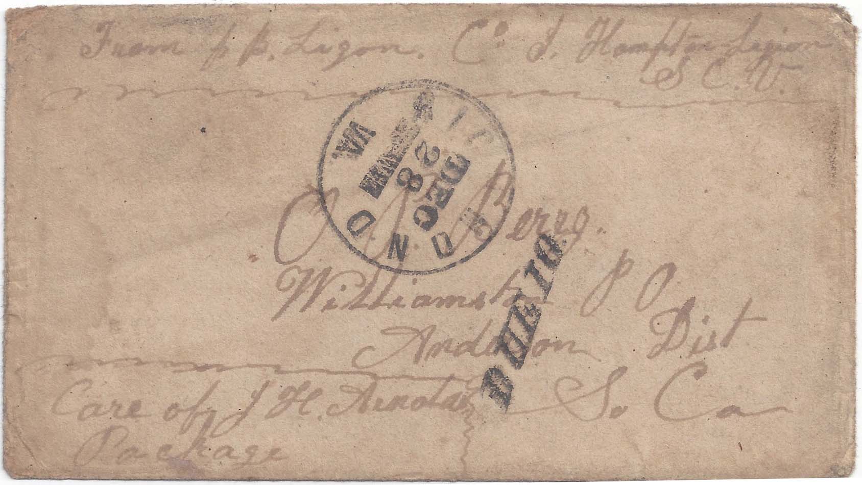 RICHMOND VA. DEC 28 (1864) circular datestamp (Powell type 6L) with matching DUE 10 (type P) on cover to O.P. Berry, Williamston PO Anderston Dist SC / Care of J. H. Arnold (?) Package. The latter annotation is apparently a private regional mail service similar to Peterson’s Package, Clark’s Package, Millway Carrier, and others, but more research needs to be done – a perfect postal history project for someone with curiosity and tenacity. There was a J.H. Arnold in the Confederate Army – a good place to start. At top of the cover is the mandated soldier’s endorsement “From J.B. Ligon Co. I Hampton Legion S.C.V.” Ex Harry Muldrow. $125.